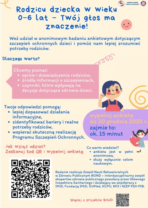 Badanie realizowane jest przez Zespół Nauk Behawioralnych w Zdrowiu Publicznym BOND we współpracy z instytucjami ochrony zdrowia (m.in. IMiD, GUMed, NFZ, NIZP PZH – PIB) oraz przy wsparciu Biura UNICEF ds. Reagowania na Potrzeby Uchodźców w Polsce. Jego celem jest lepsze zrozumienie, w jaki sposób rodzice podejmują decyzje dotyczące szczepień dzieci, z jakich źródeł czerpią informacje oraz jakie wątpliwości lub potrzeby pojawiają się w tym procesie.
