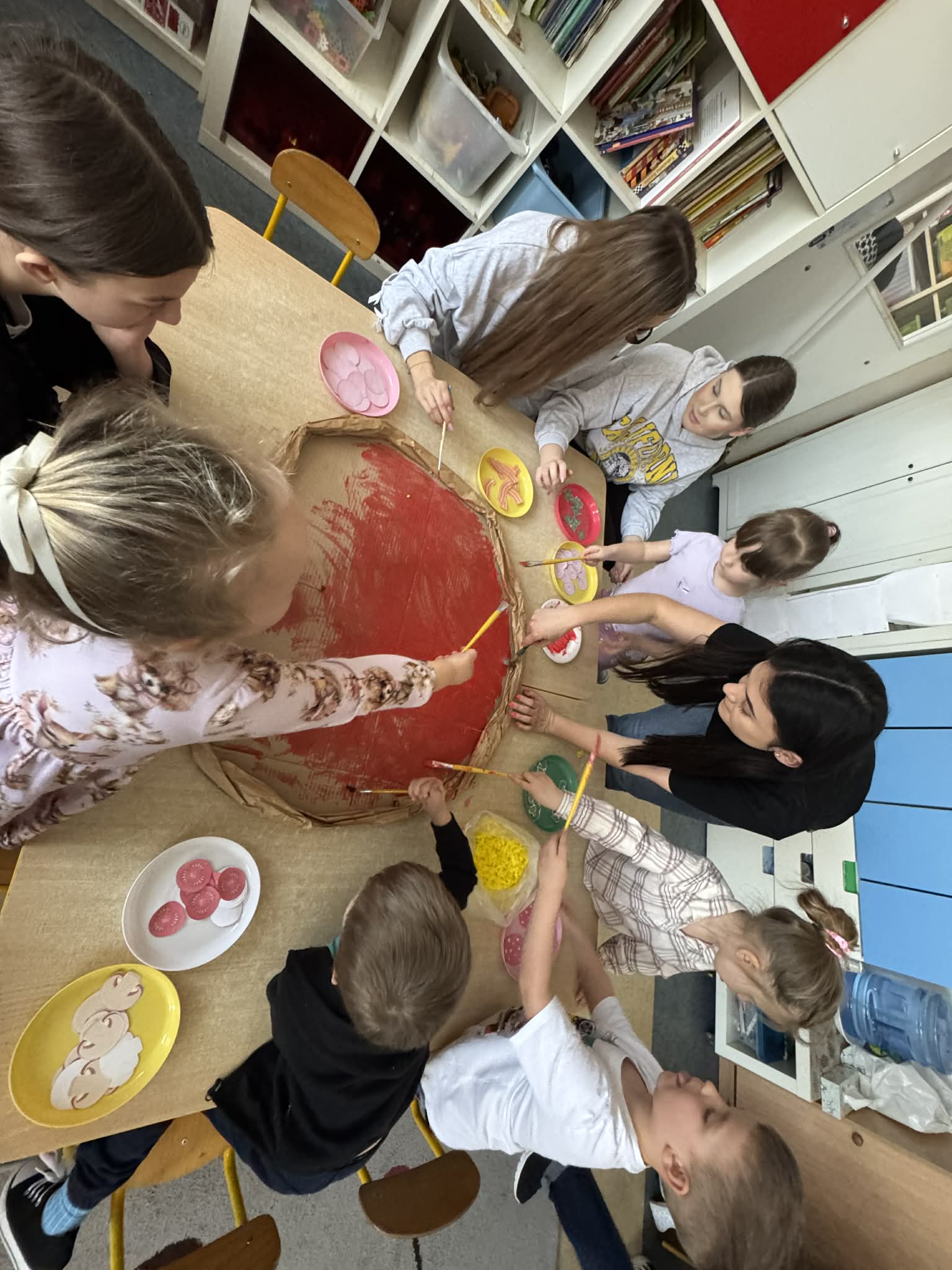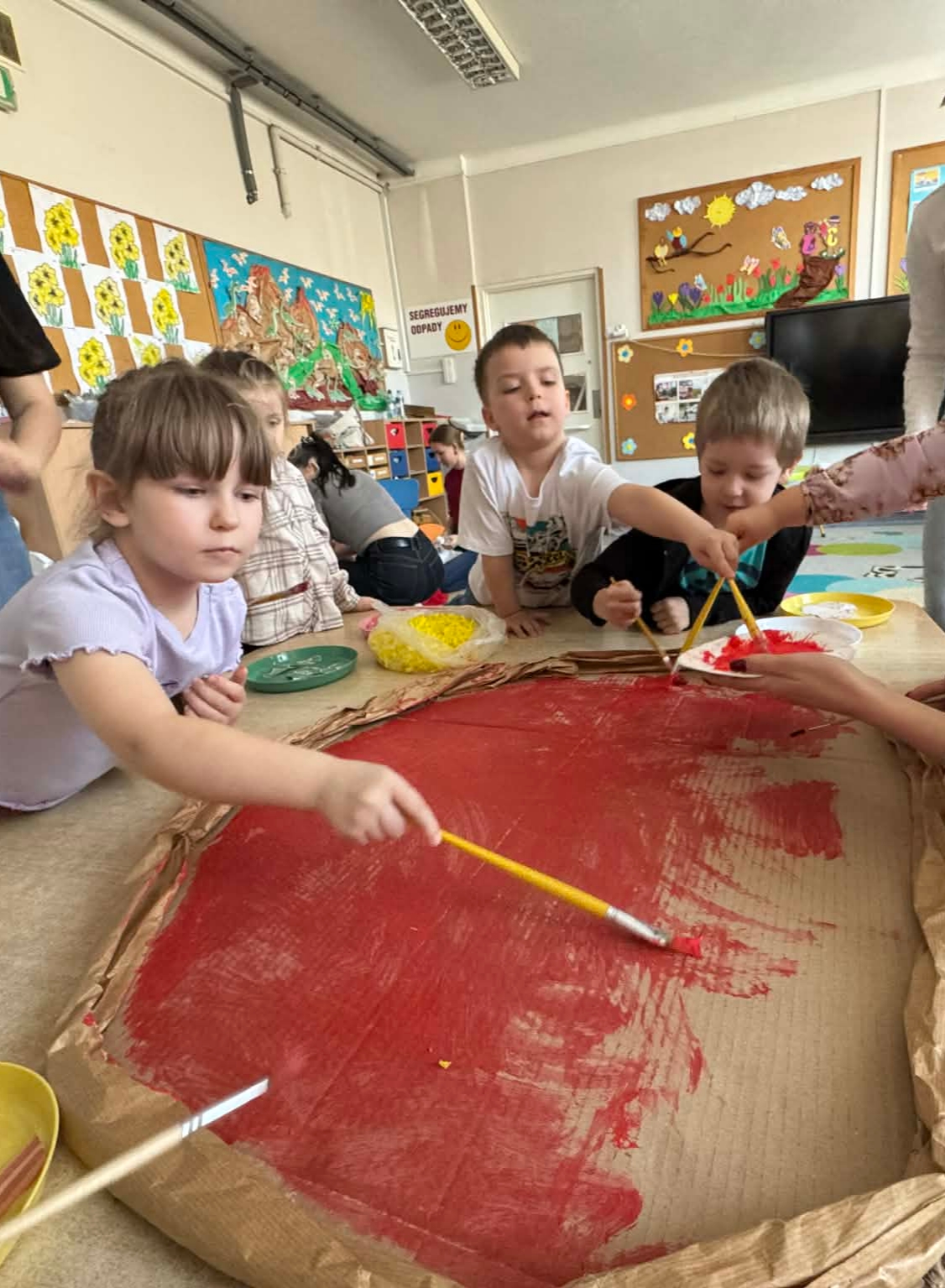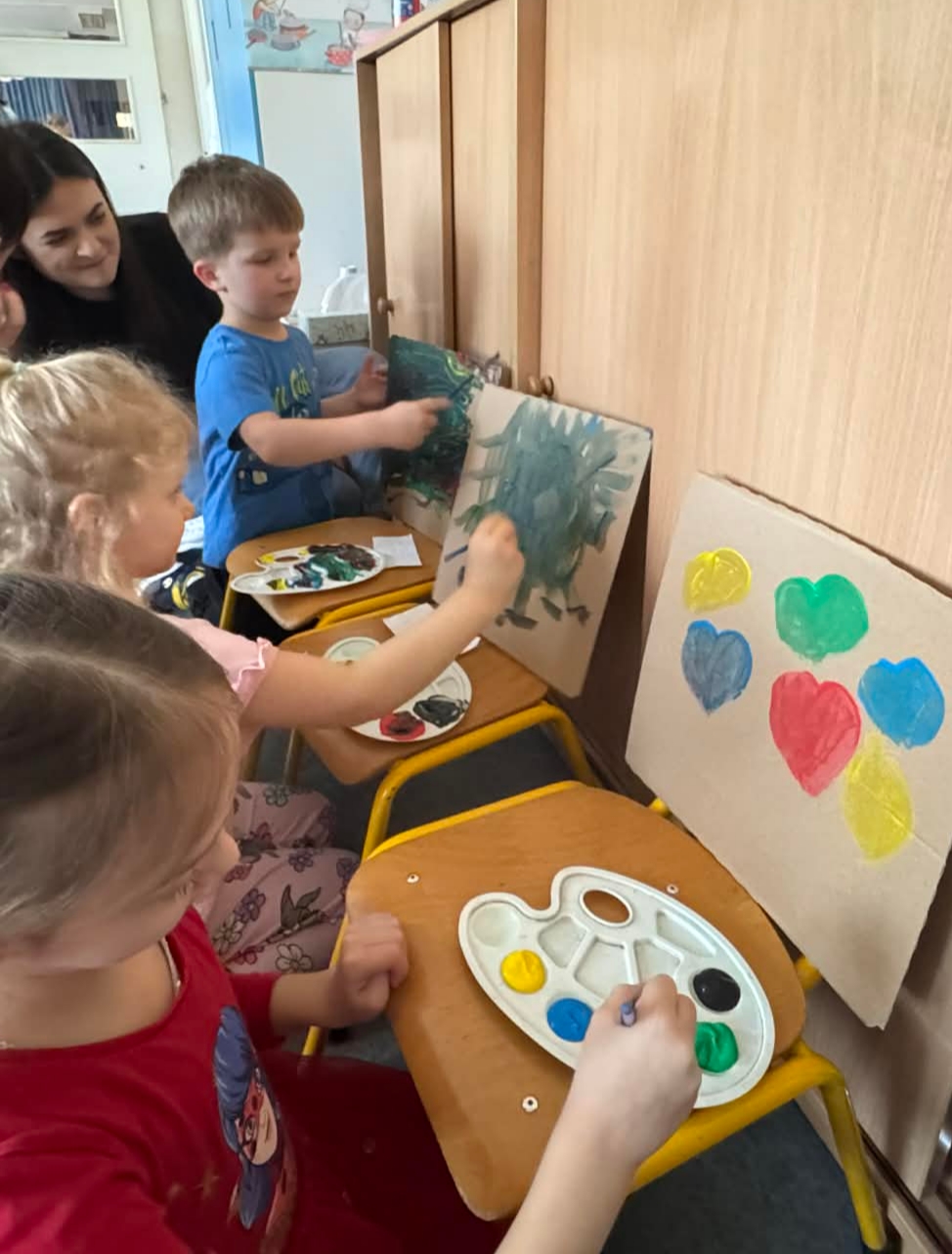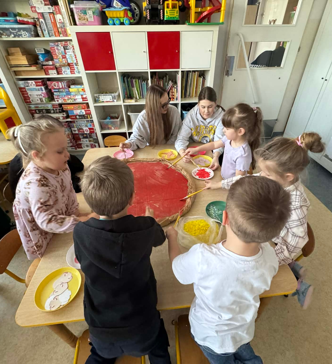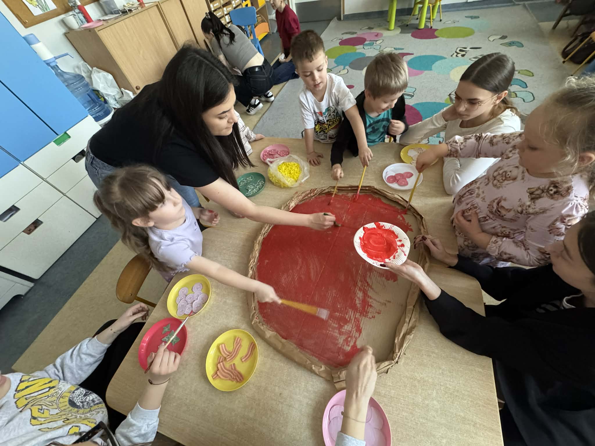 Na początku dzieci rozwiązywały zagadki dotyczące różnych profesji. Wspólnie doszliśmy do ważnego wniosku – każdy zawód jest potrzebny i ważny. Następnie dzieci losowały przydział do grup za pomocą atrybutów związanych z zawodami: garnek – kucharz, nożyczki – fryzjer, pędzel – malarz. Po losowaniu wszyscy z dużym zaangażowaniem przystąpili do pracy. Malarze stworzyli swoje małe pracownie i malowali farbami na przygotowanych sztalugach. Kucharze przygotowali ogromną pizzę – najpierw pomalowali ją farbami, a następnie ozdabiali różnymi „składnikami”.Fryzjerzy zajęli się stylizacją włosów – z wielką precyzją obcinali i układali fryzury swoim modelom. Podczas zabawy dzieci rozwijały umiejętność współpracy w grupie, sprawność manualną oraz poznawały różne zawody. Taka forma zajęć bardzo podobała się wszystkim naszym przedszkolakom. W zajęciach uczestniczyły także studentki z Akademii Piotrkowskiej, które obserwowały nasze działania i chętnie włączyły się do wspólnej pracy z dziećmi.