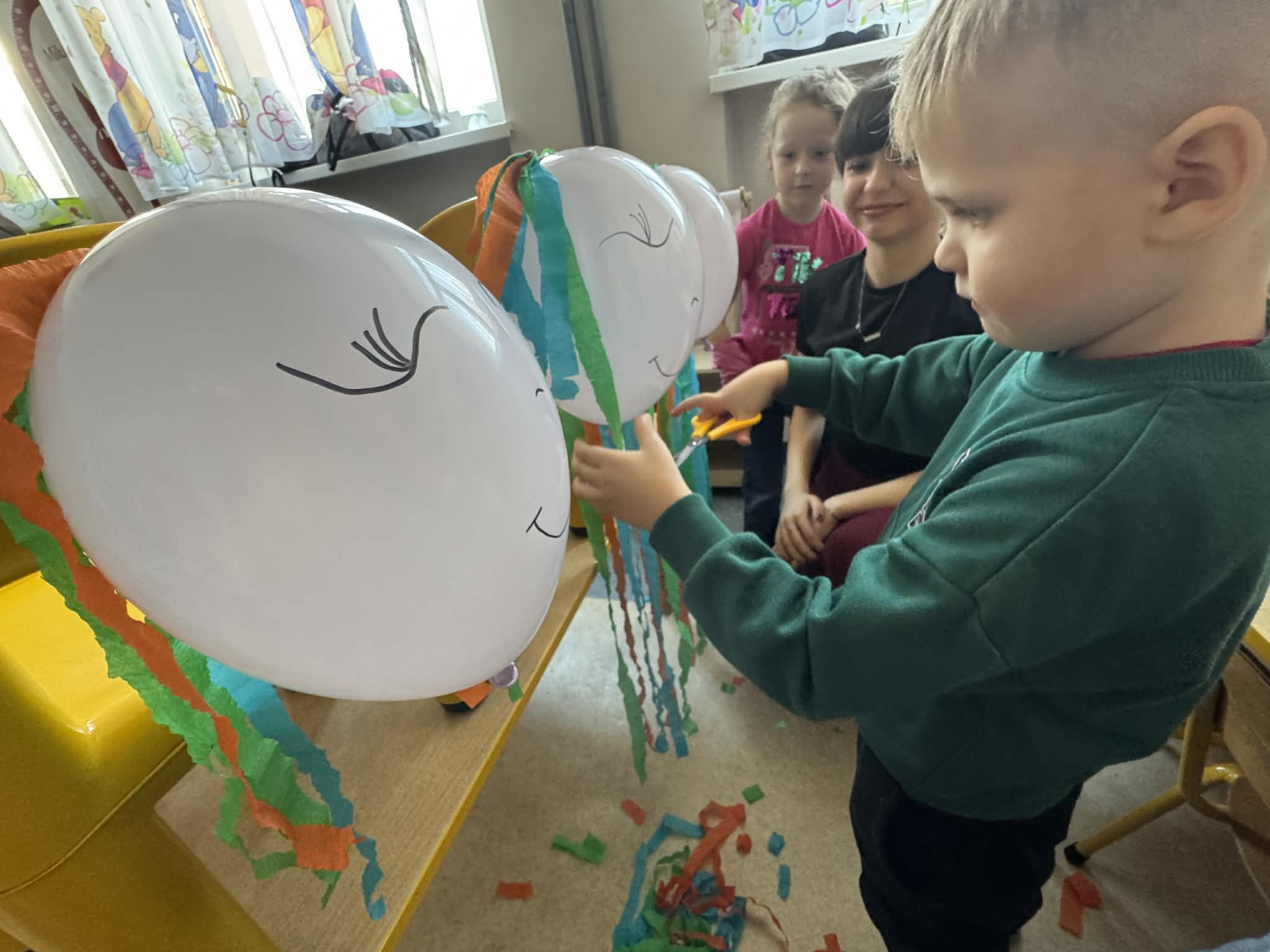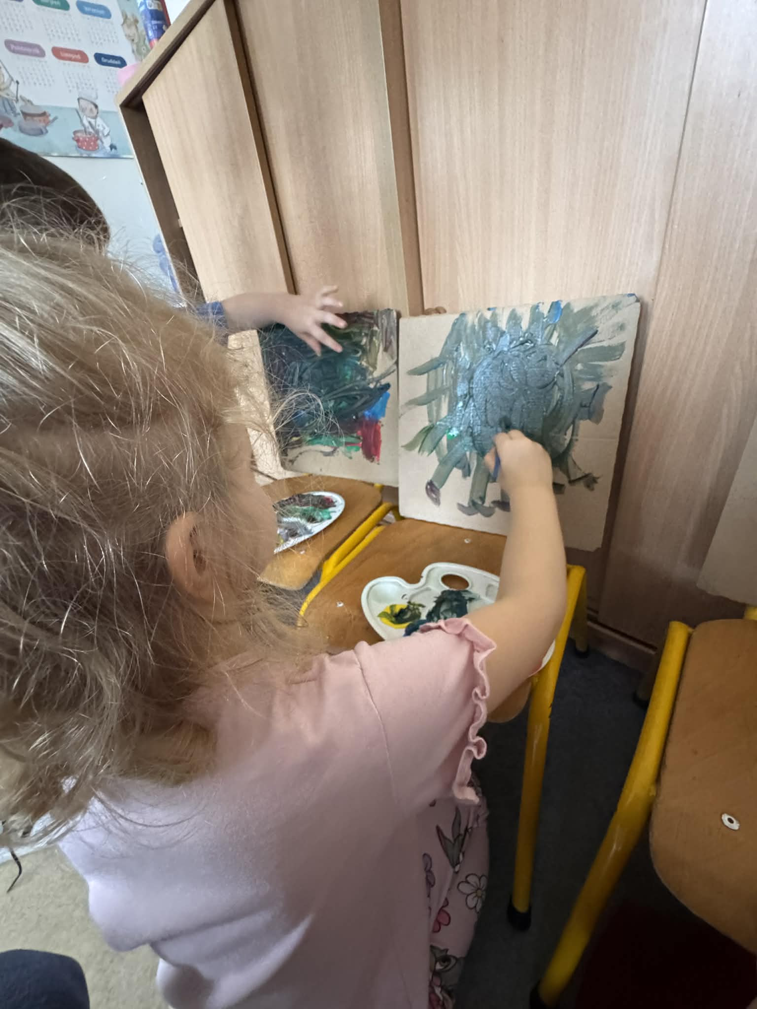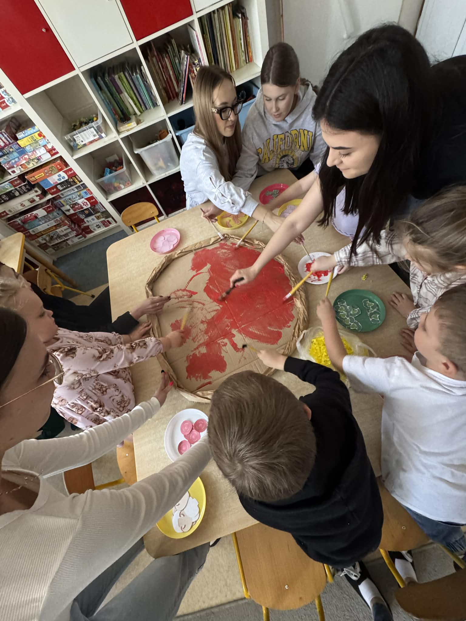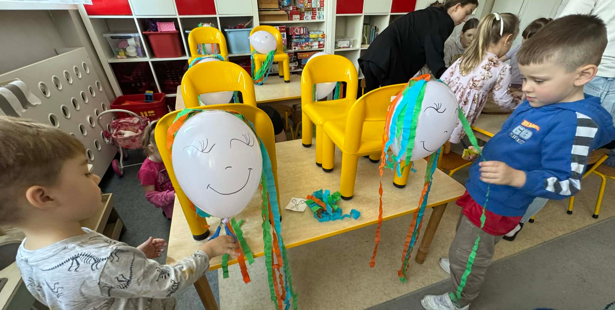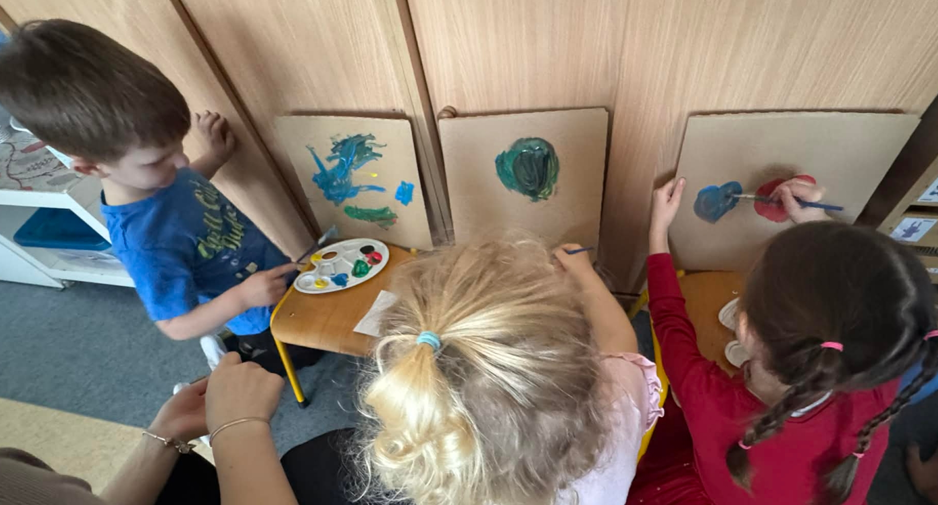 Na początku dzieci rozwiązywały zagadki dotyczące różnych profesji. Wspólnie doszliśmy do ważnego wniosku – każdy zawód jest potrzebny i ważny. Następnie dzieci losowały przydział do grup za pomocą atrybutów związanych z zawodami: garnek – kucharz, nożyczki – fryzjer, pędzel – malarz. Po losowaniu wszyscy z dużym zaangażowaniem przystąpili do pracy. Malarze stworzyli swoje małe pracownie i malowali farbami na przygotowanych sztalugach. Kucharze przygotowali ogromną pizzę – najpierw pomalowali ją farbami, a następnie ozdabiali różnymi „składnikami”.Fryzjerzy zajęli się stylizacją włosów – z wielką precyzją obcinali i układali fryzury swoim modelom. Podczas zabawy dzieci rozwijały umiejętność współpracy w grupie, sprawność manualną oraz poznawały różne zawody. Taka forma zajęć bardzo podobała się wszystkim naszym przedszkolakom. W zajęciach uczestniczyły także studentki z Akademii Piotrkowskiej, które obserwowały nasze działania i chętnie włączyły się do wspólnej pracy z dziećmi.