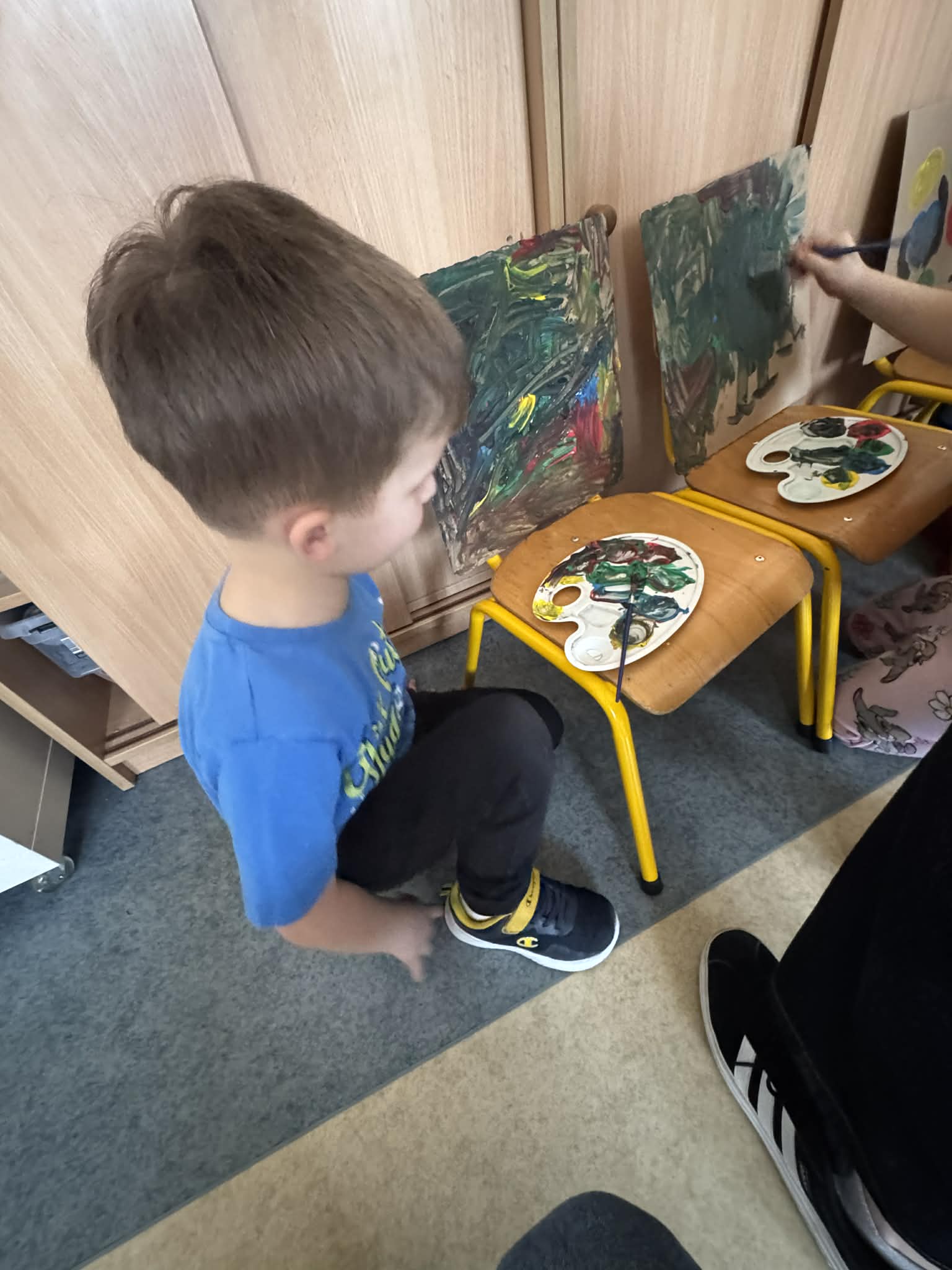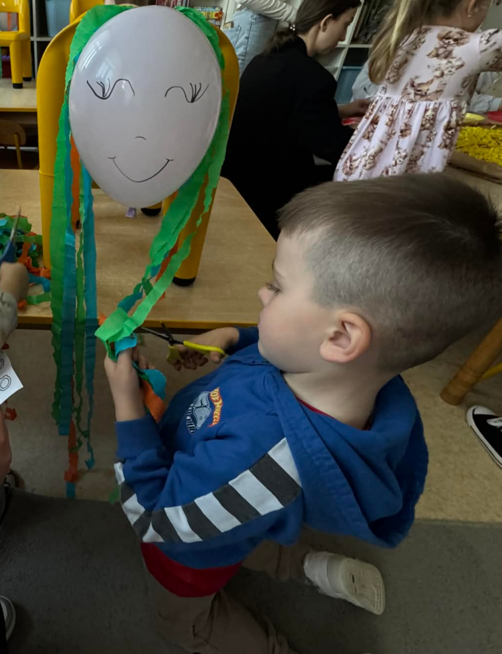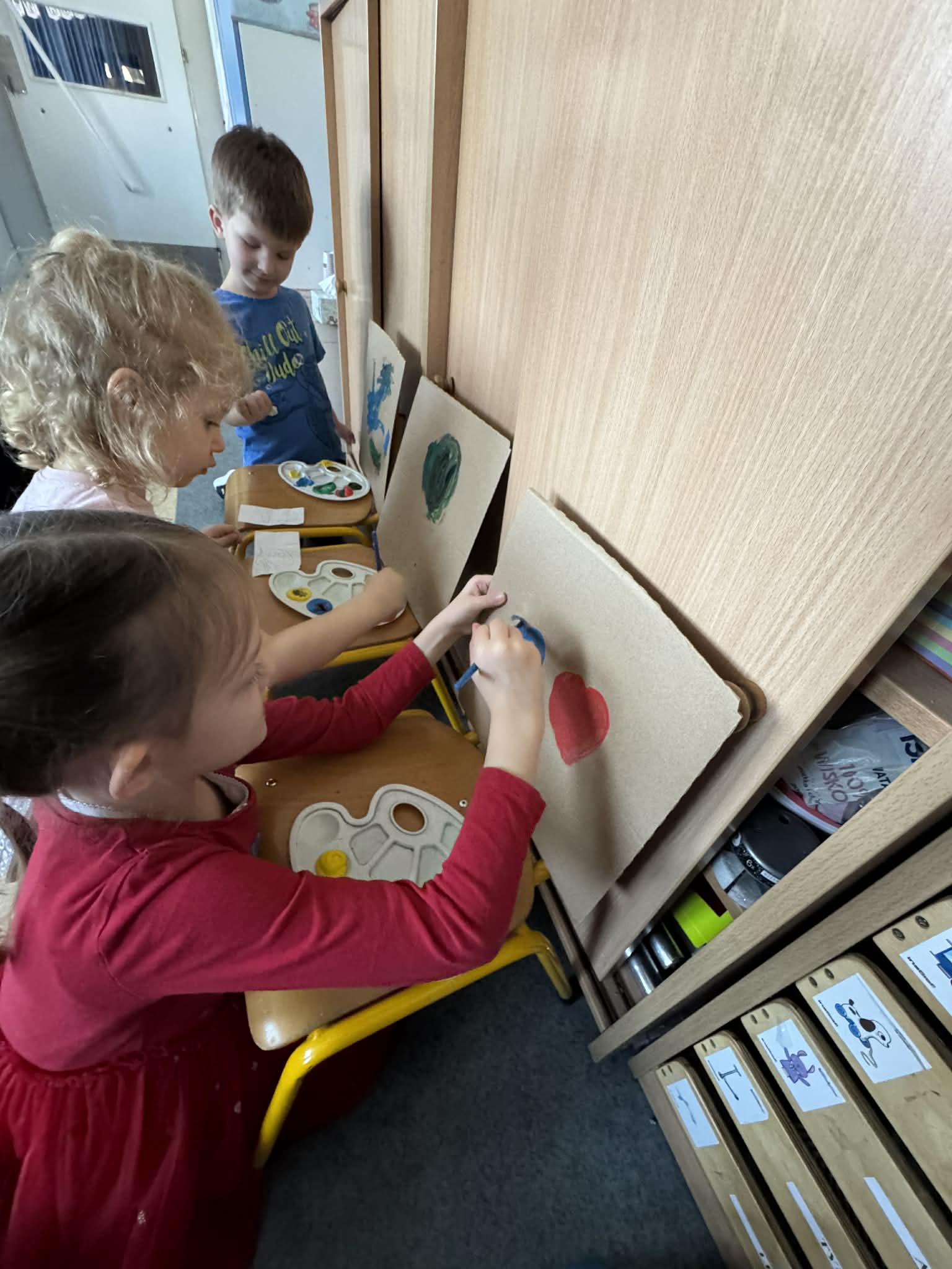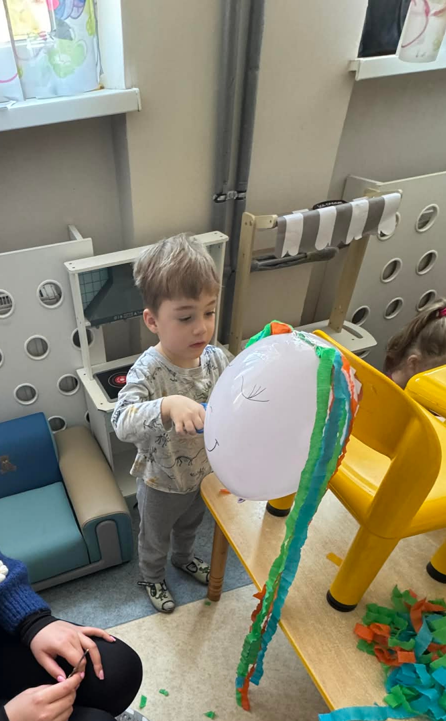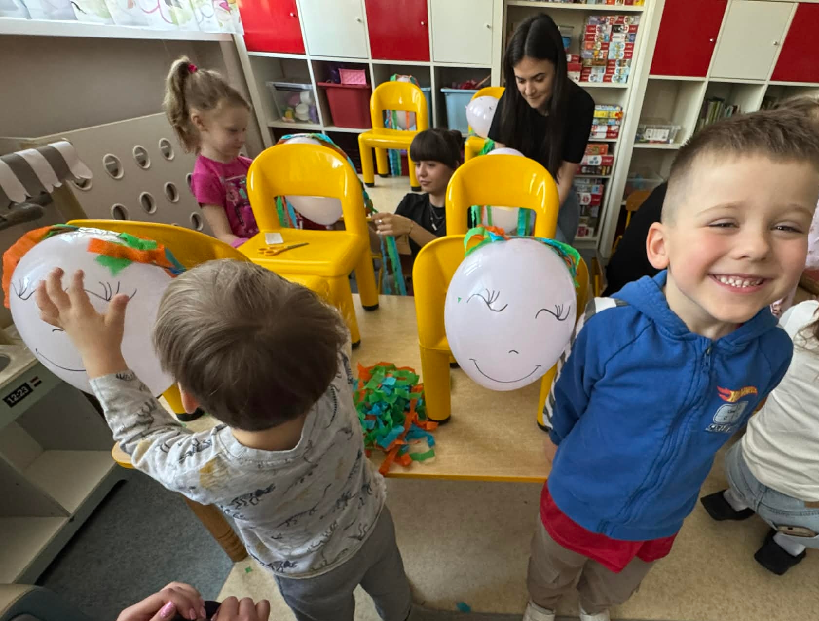 Na początku dzieci rozwiązywały zagadki dotyczące różnych profesji. Wspólnie doszliśmy do ważnego wniosku – każdy zawód jest potrzebny i ważny. Następnie dzieci losowały przydział do grup za pomocą atrybutów związanych z zawodami: garnek – kucharz, nożyczki – fryzjer, pędzel – malarz. Po losowaniu wszyscy z dużym zaangażowaniem przystąpili do pracy. Malarze stworzyli swoje małe pracownie i malowali farbami na przygotowanych sztalugach. Kucharze przygotowali ogromną pizzę – najpierw pomalowali ją farbami, a następnie ozdabiali różnymi „składnikami”.Fryzjerzy zajęli się stylizacją włosów – z wielką precyzją obcinali i układali fryzury swoim modelom. Podczas zabawy dzieci rozwijały umiejętność współpracy w grupie, sprawność manualną oraz poznawały różne zawody. Taka forma zajęć bardzo podobała się wszystkim naszym przedszkolakom. W zajęciach uczestniczyły także studentki z Akademii Piotrkowskiej, które obserwowały nasze działania i chętnie włączyły się do wspólnej pracy z dziećmi.