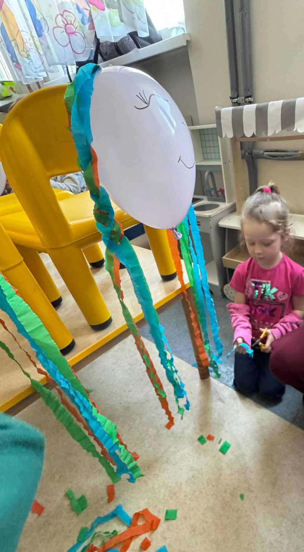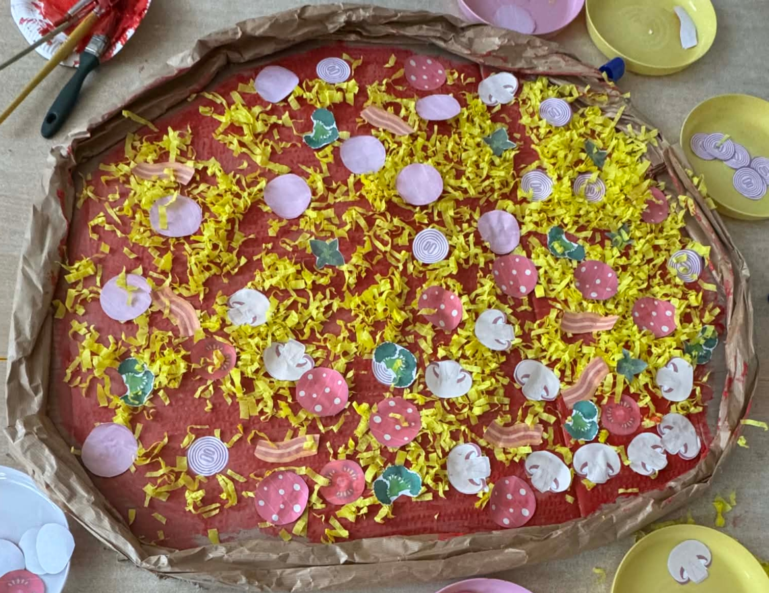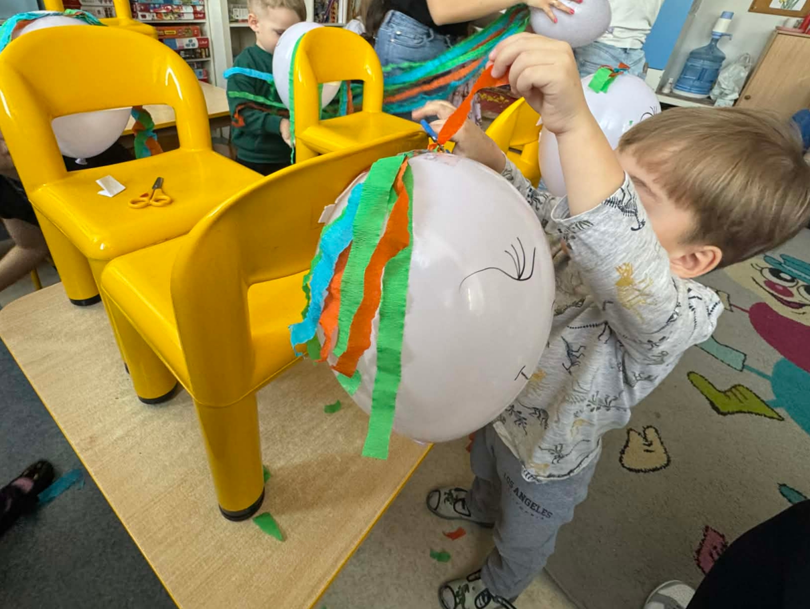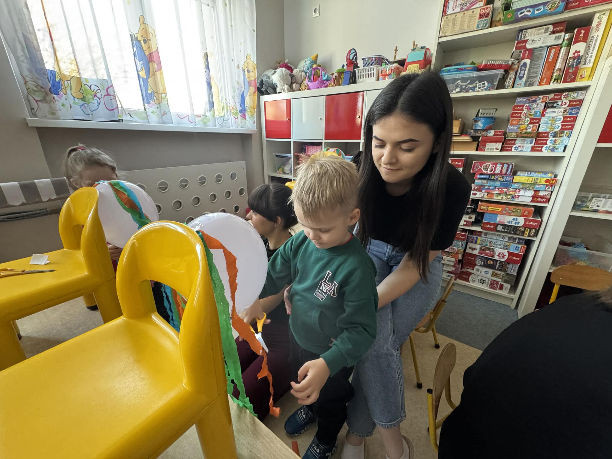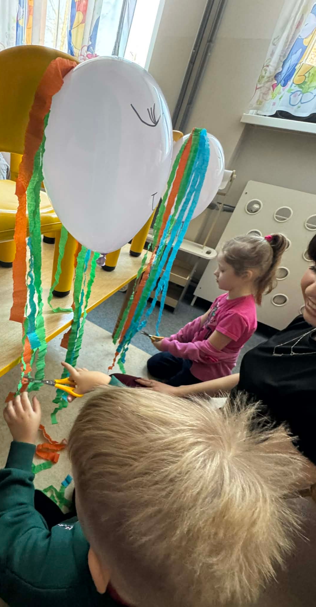 Na początku dzieci rozwiązywały zagadki dotyczące różnych profesji. Wspólnie doszliśmy do ważnego wniosku – każdy zawód jest potrzebny i ważny. Następnie dzieci losowały przydział do grup za pomocą atrybutów związanych z zawodami: garnek – kucharz, nożyczki – fryzjer, pędzel – malarz. Po losowaniu wszyscy z dużym zaangażowaniem przystąpili do pracy. Malarze stworzyli swoje małe pracownie i malowali farbami na przygotowanych sztalugach. Kucharze przygotowali ogromną pizzę – najpierw pomalowali ją farbami, a następnie ozdabiali różnymi „składnikami”.Fryzjerzy zajęli się stylizacją włosów – z wielką precyzją obcinali i układali fryzury swoim modelom. Podczas zabawy dzieci rozwijały umiejętność współpracy w grupie, sprawność manualną oraz poznawały różne zawody. Taka forma zajęć bardzo podobała się wszystkim naszym przedszkolakom. W zajęciach uczestniczyły także studentki z Akademii Piotrkowskiej, które obserwowały nasze działania i chętnie włączyły się do wspólnej pracy z dziećmi.
