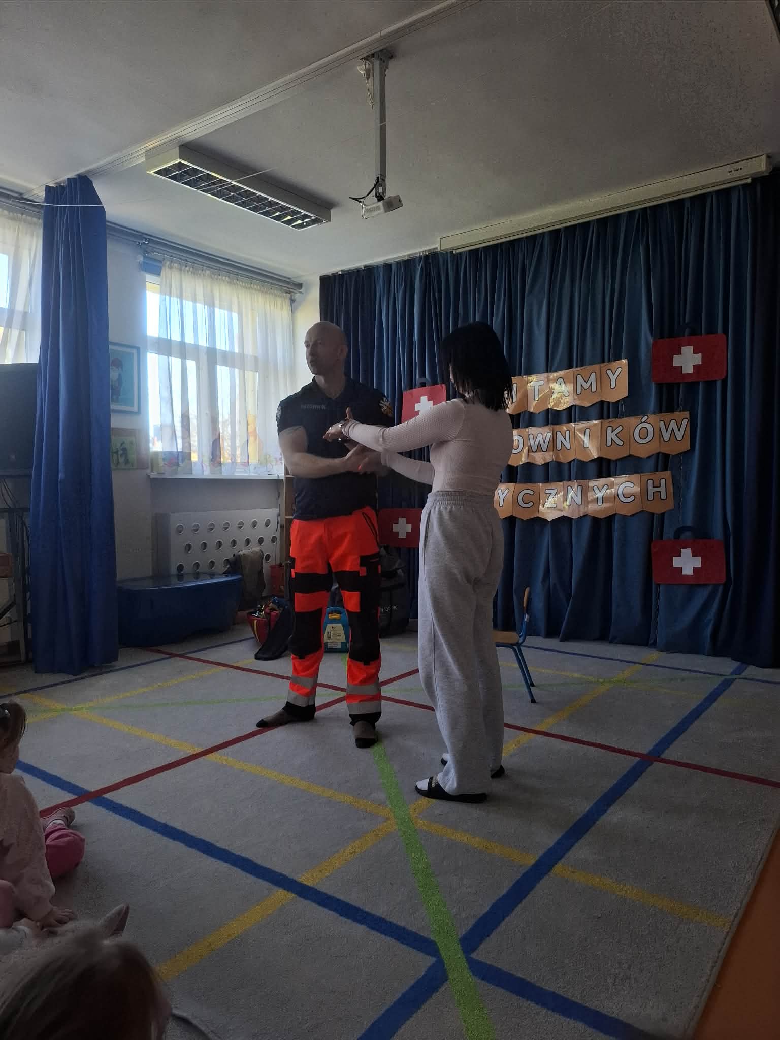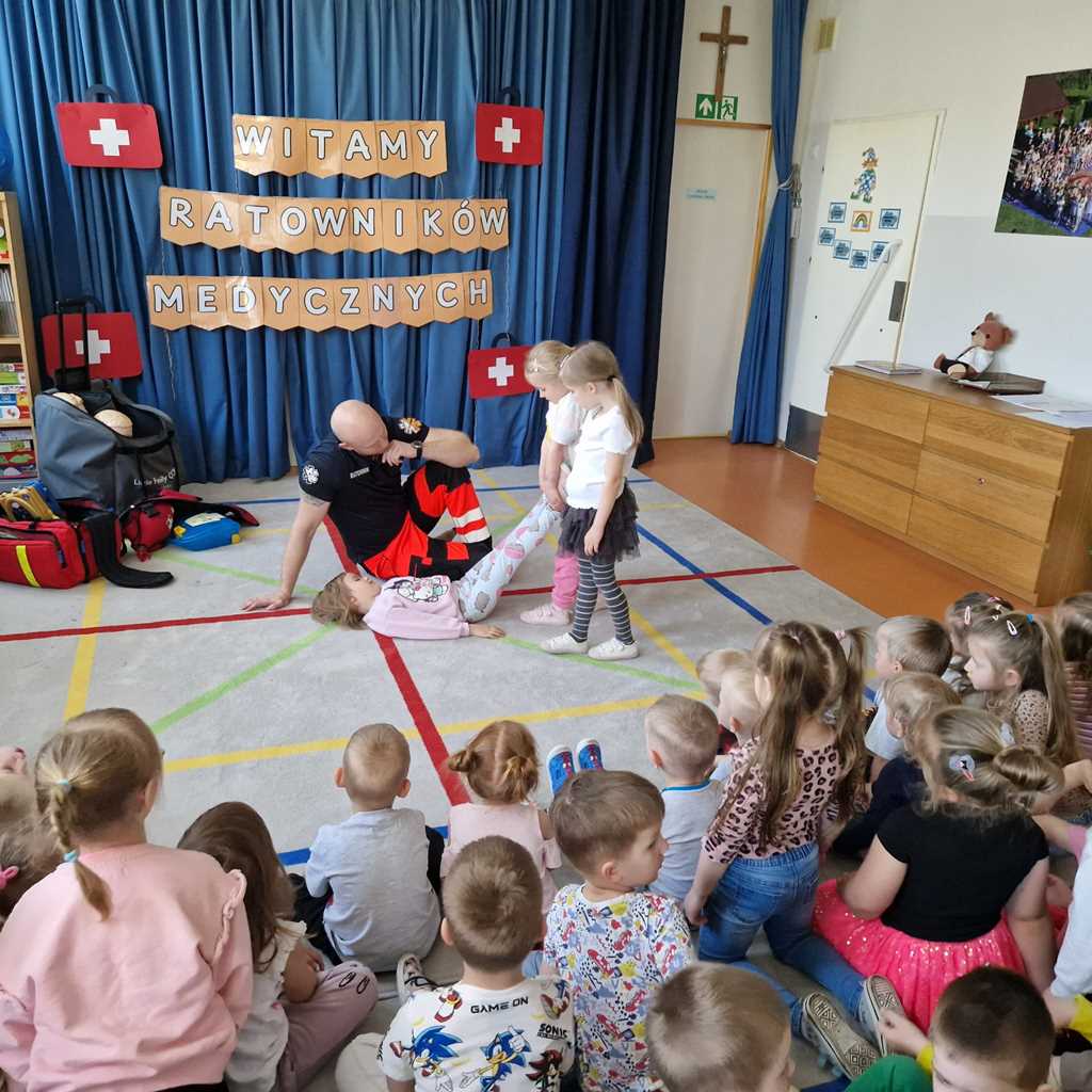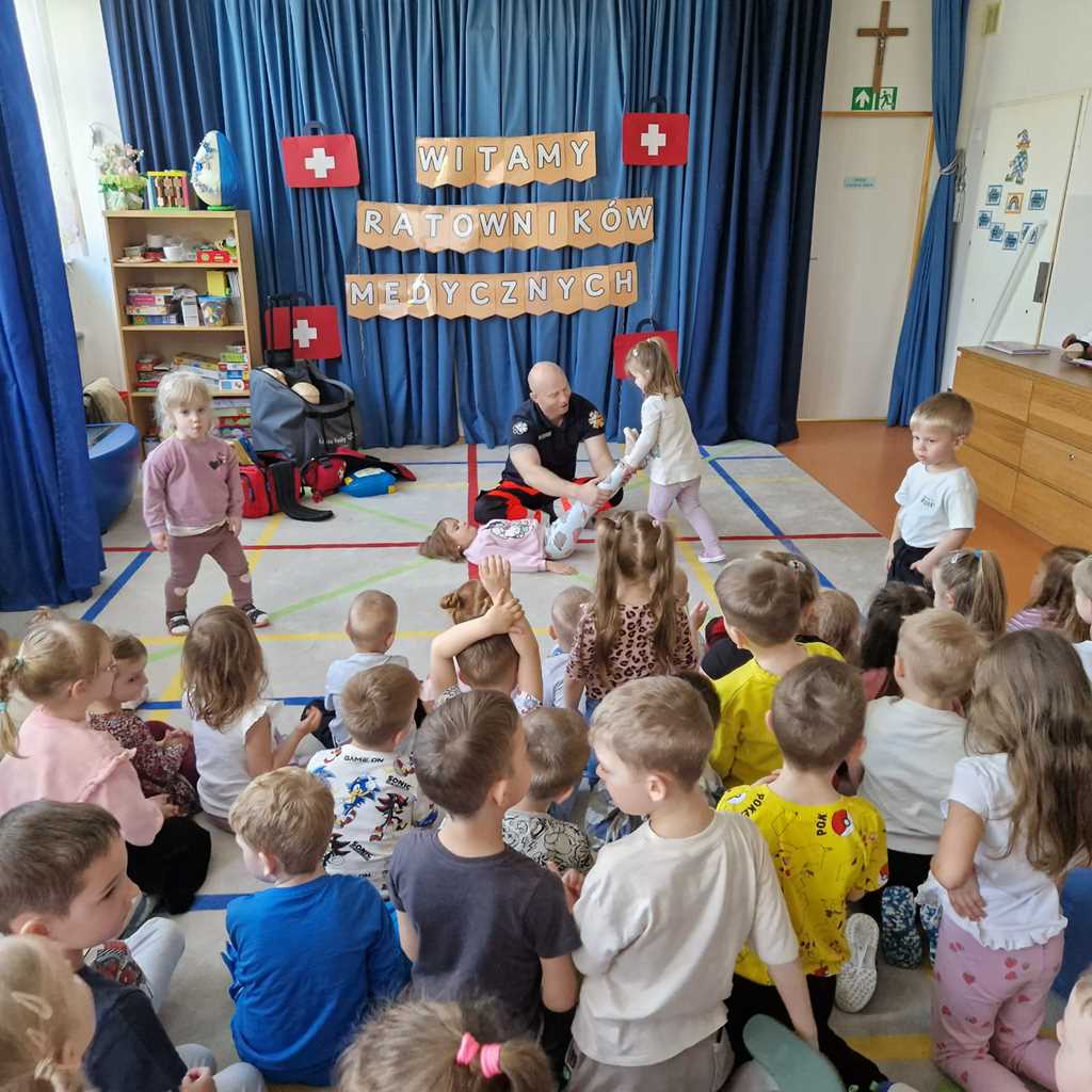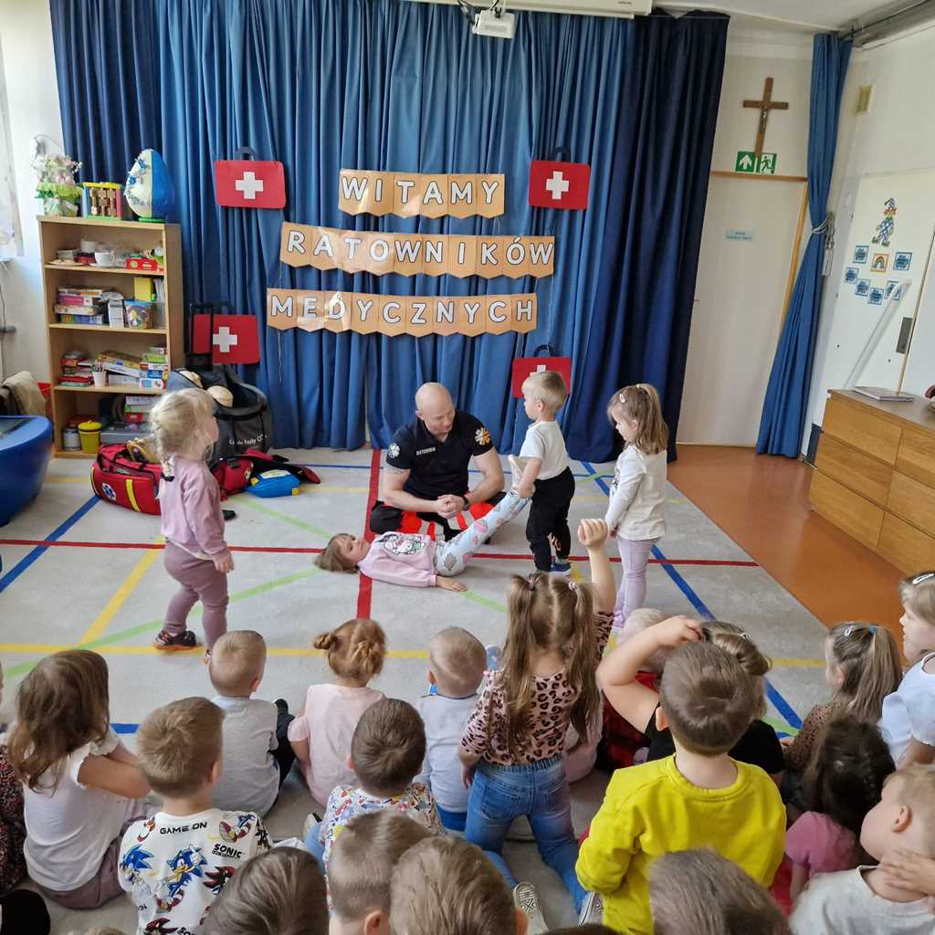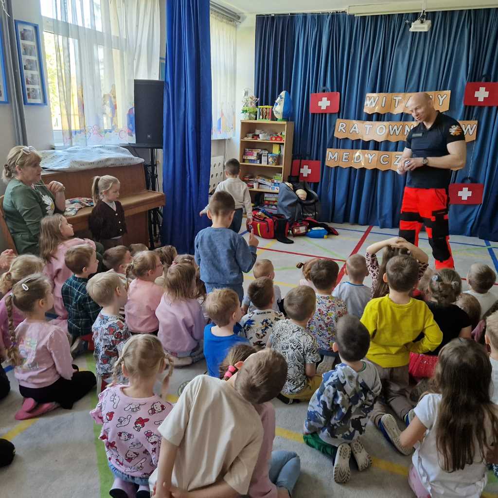 W naszym przedszkolu w dniu 23.04.2026 roku odbyło się wyjątkowe spotkanie z ratownikiem medycznym, który przybliżył dzieciom zasady udzielania pierwszej pomocy. Przedszkolaki dowiedziały się, jak zachować się w sytuacji zagrożenia oraz w jaki sposób wezwać pomoc. Gość zaprezentował podstawowe czynności ratunkowe, a dzieci mogły aktywnie uczestniczyć w pokazie. Największym zainteresowaniem cieszyła się możliwość obejrzenia sprzętu medycznego oraz ćwiczenia na fantomie. Spotkanie było nie tylko bardzo ciekawe, ale przede wszystkim pouczające i dostosowane do wieku dzieci. Dzięki tej wizycie przedszkolaki zdobyły cenną wiedzę, która może pomóc w sytuacjach zagrożenia zdrowia lub życia. To była niezwykle wartościowa lekcja bezpieczeństwa.