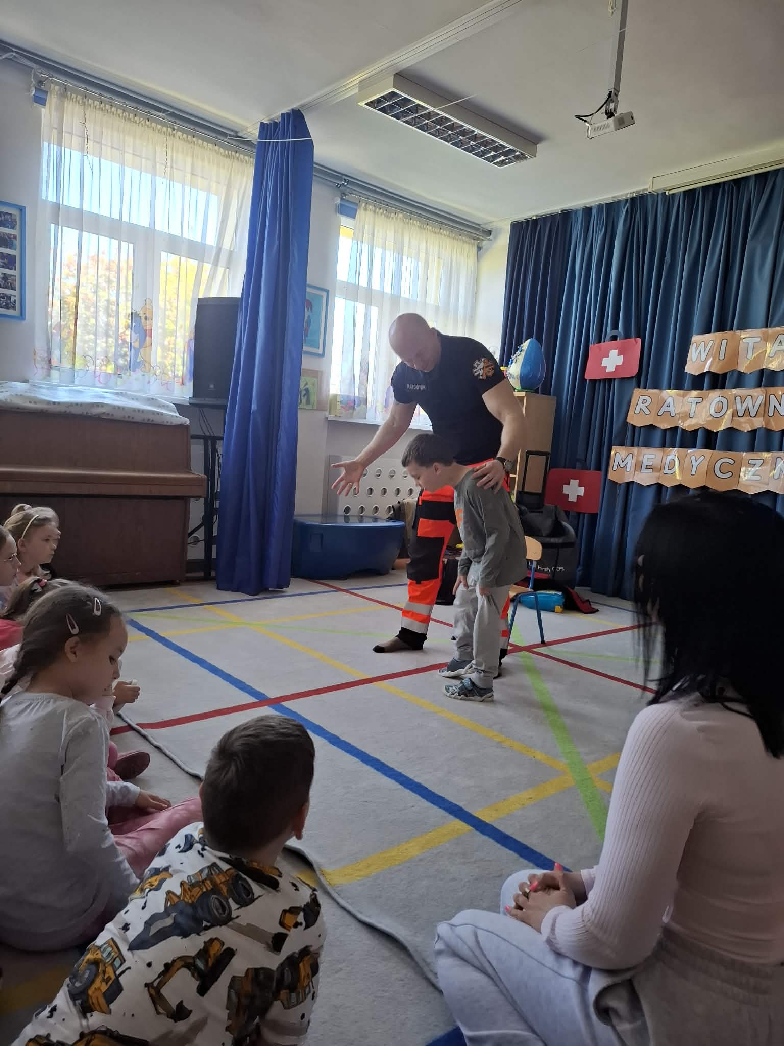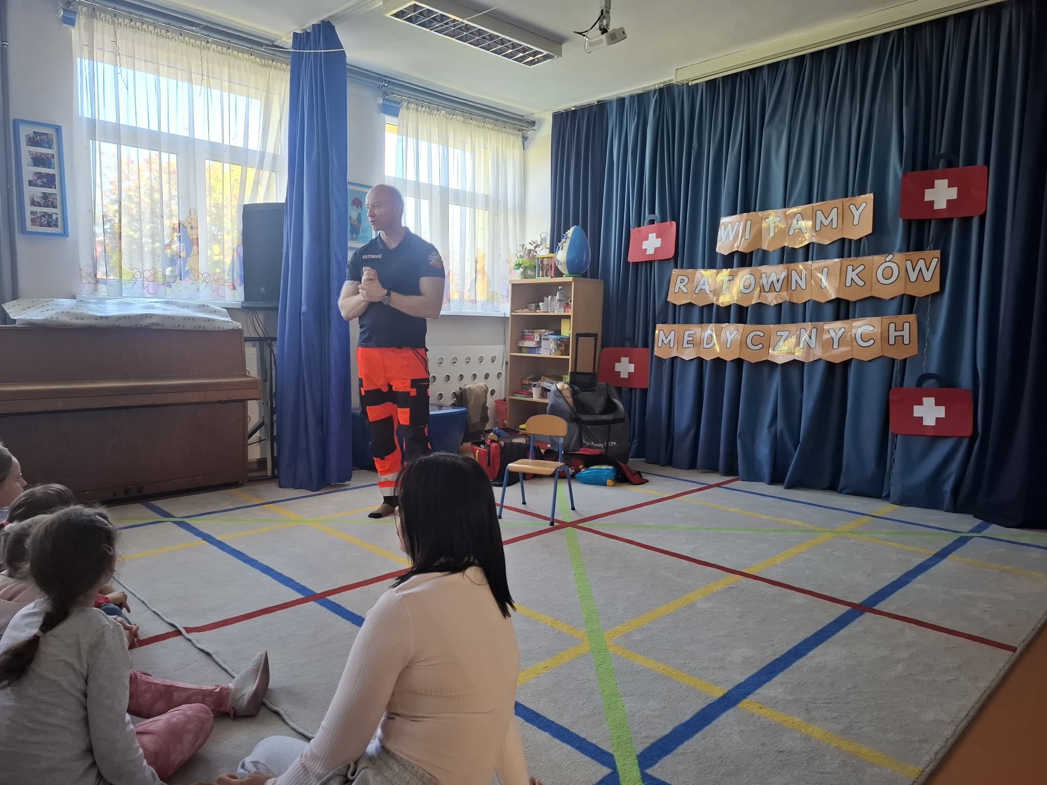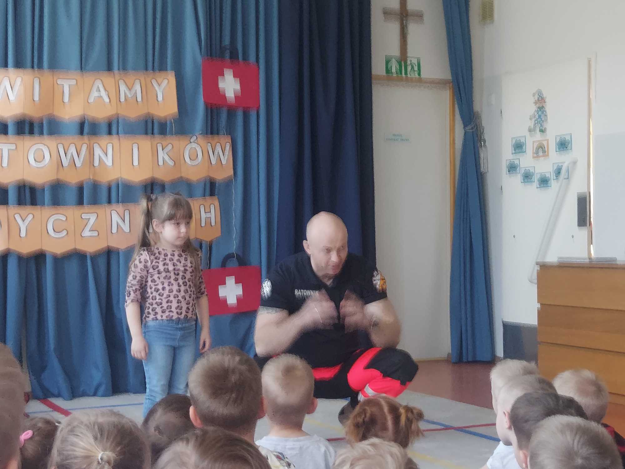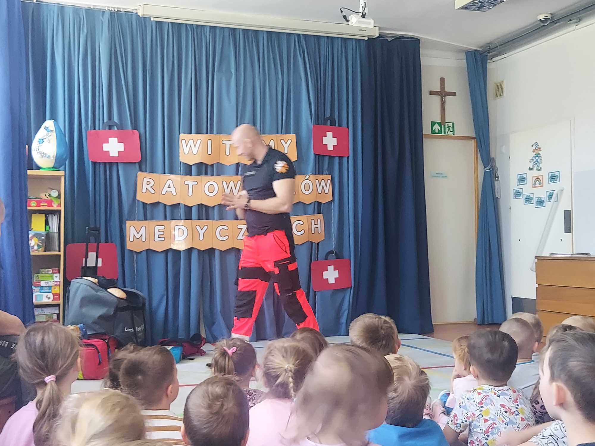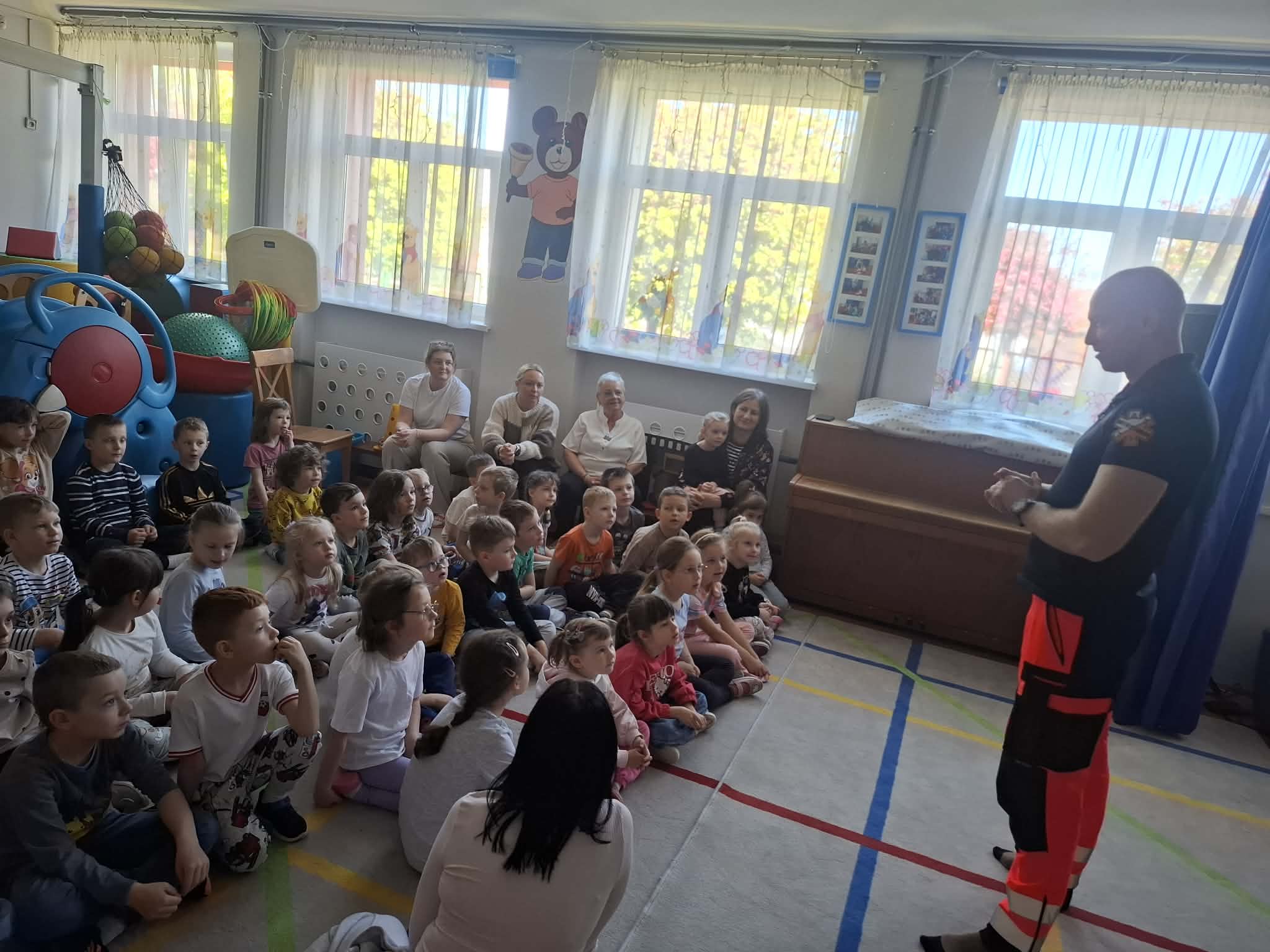 W naszym przedszkolu w dniu 23.04.2026 roku odbyło się wyjątkowe spotkanie z ratownikiem medycznym, który przybliżył dzieciom zasady udzielania pierwszej pomocy. Przedszkolaki dowiedziały się, jak zachować się w sytuacji zagrożenia oraz w jaki sposób wezwać pomoc. Gość zaprezentował podstawowe czynności ratunkowe, a dzieci mogły aktywnie uczestniczyć w pokazie. Największym zainteresowaniem cieszyła się możliwość obejrzenia sprzętu medycznego oraz ćwiczenia na fantomie. Spotkanie było nie tylko bardzo ciekawe, ale przede wszystkim pouczające i dostosowane do wieku dzieci. Dzięki tej wizycie przedszkolaki zdobyły cenną wiedzę, która może pomóc w sytuacjach zagrożenia zdrowia lub życia. To była niezwykle wartościowa lekcja bezpieczeństwa.