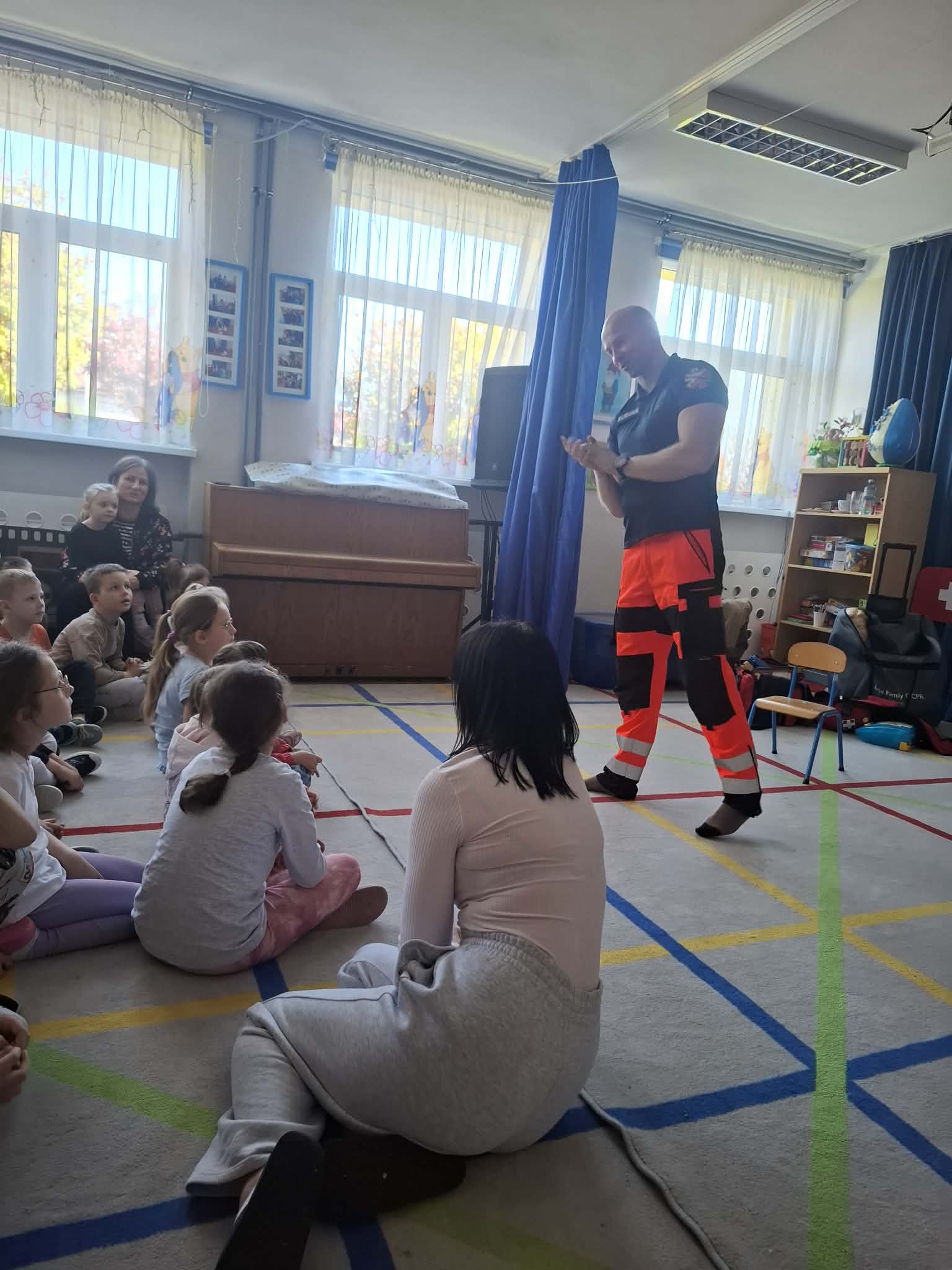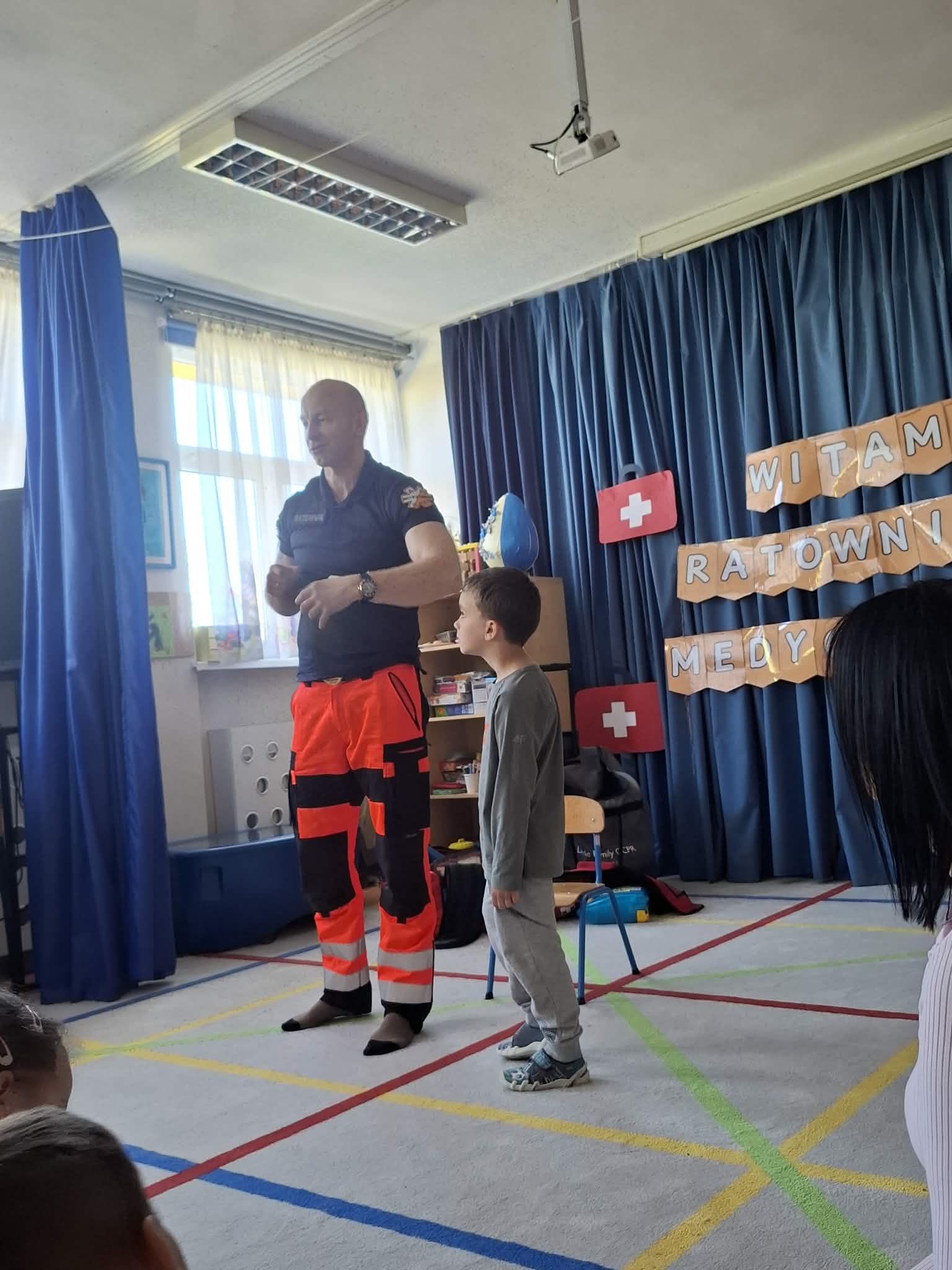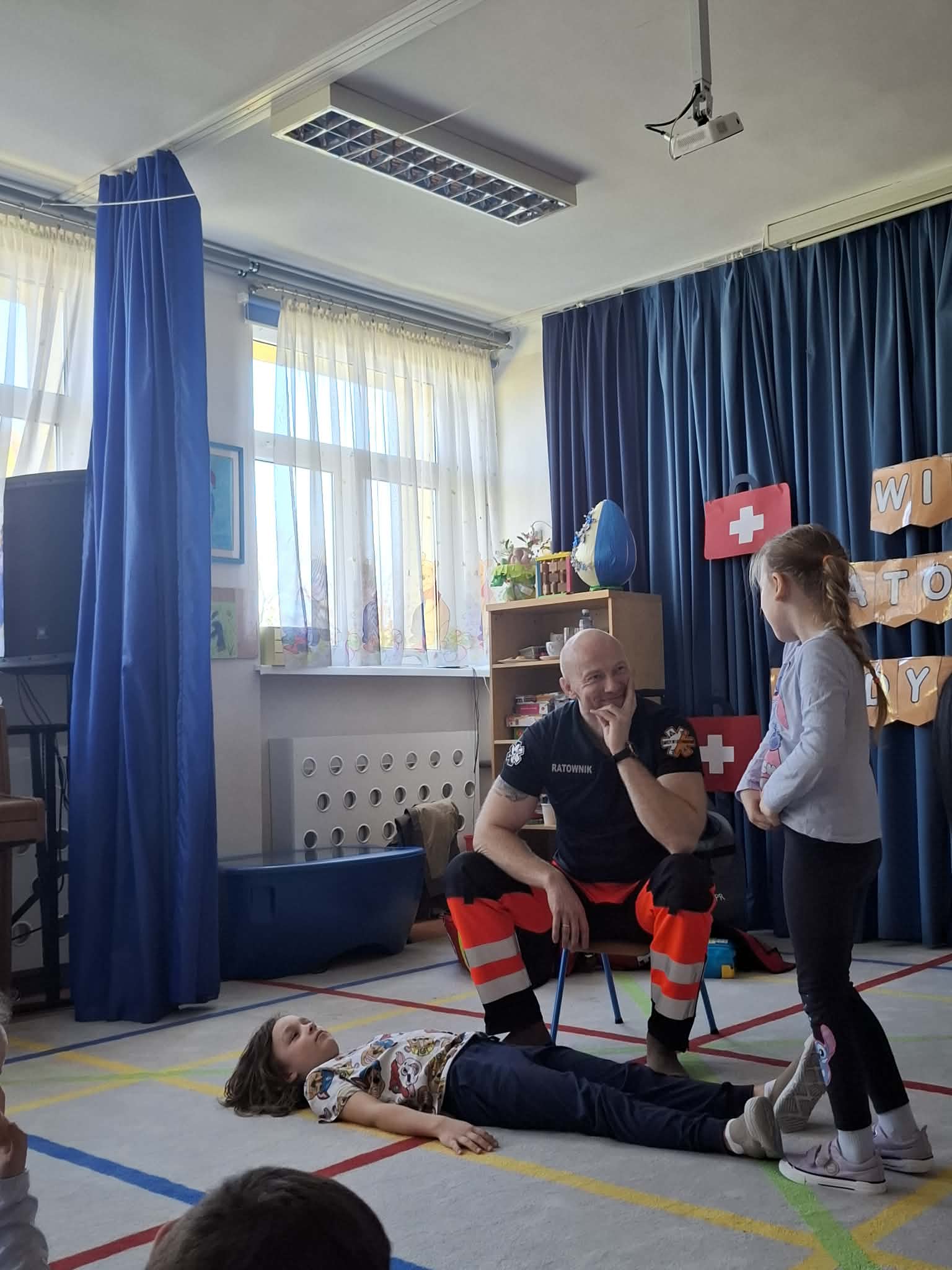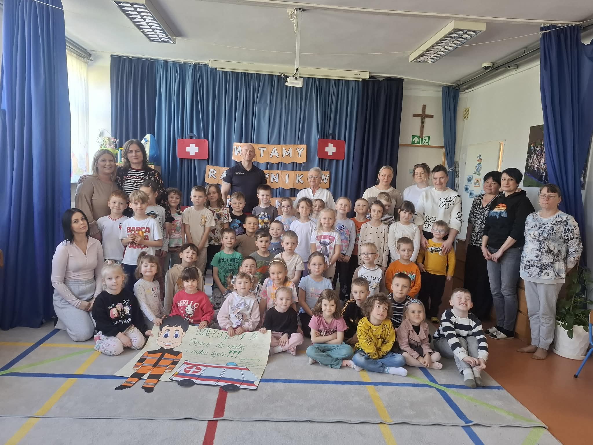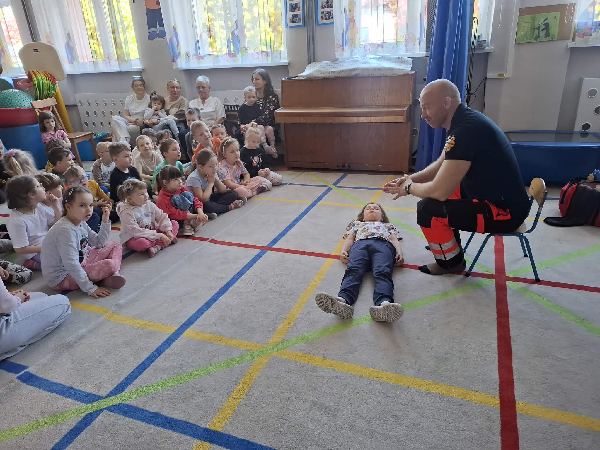 W naszym przedszkolu w dniu 23.04.2026 roku odbyło się wyjątkowe spotkanie z ratownikiem medycznym, który przybliżył dzieciom zasady udzielania pierwszej pomocy. Przedszkolaki dowiedziały się, jak zachować się w sytuacji zagrożenia oraz w jaki sposób wezwać pomoc. Gość zaprezentował podstawowe czynności ratunkowe, a dzieci mogły aktywnie uczestniczyć w pokazie. Największym zainteresowaniem cieszyła się możliwość obejrzenia sprzętu medycznego oraz ćwiczenia na fantomie. Spotkanie było nie tylko bardzo ciekawe, ale przede wszystkim pouczające i dostosowane do wieku dzieci. Dzięki tej wizycie przedszkolaki zdobyły cenną wiedzę, która może pomóc w sytuacjach zagrożenia zdrowia lub życia. To była niezwykle wartościowa lekcja bezpieczeństwa.