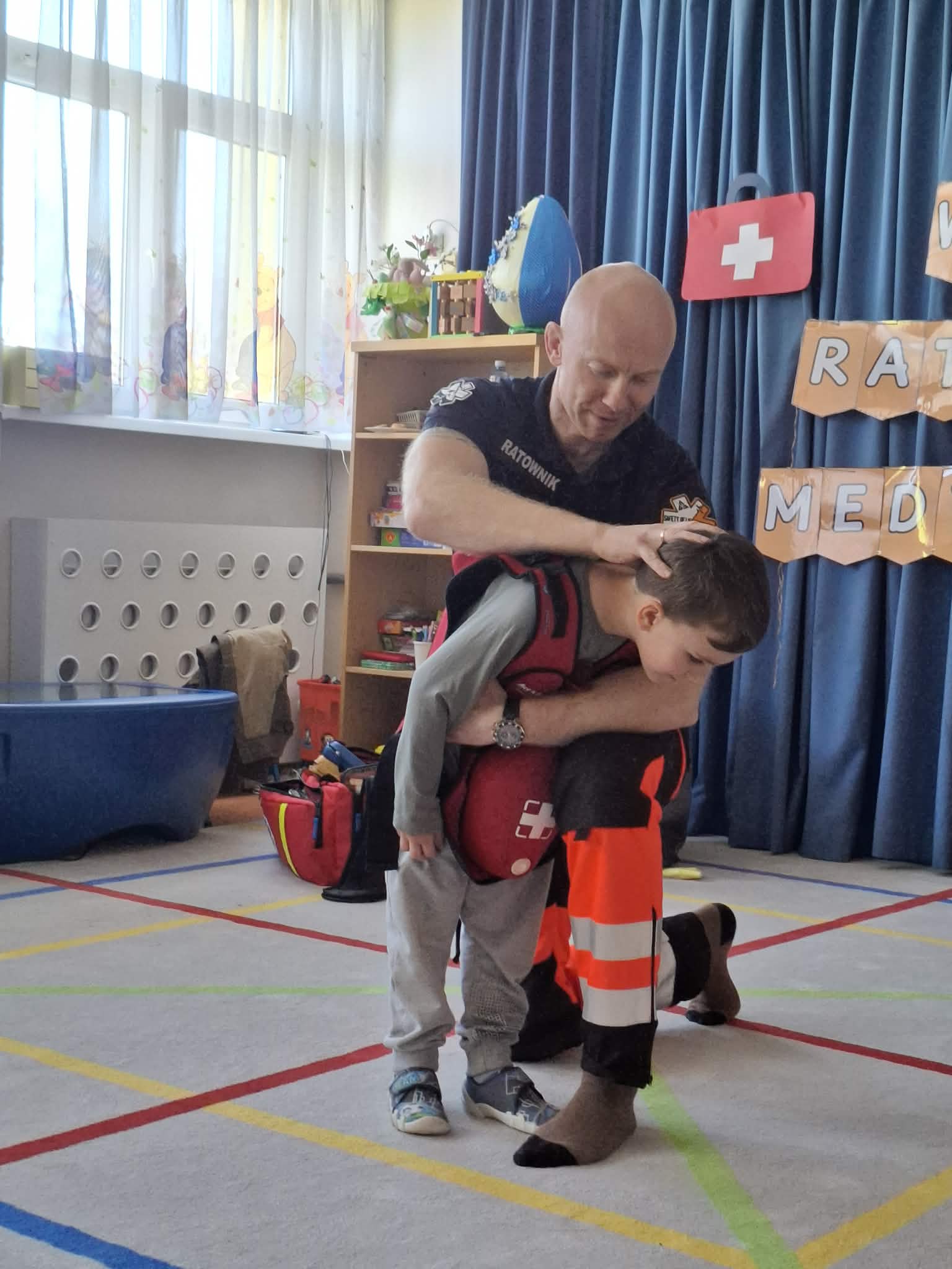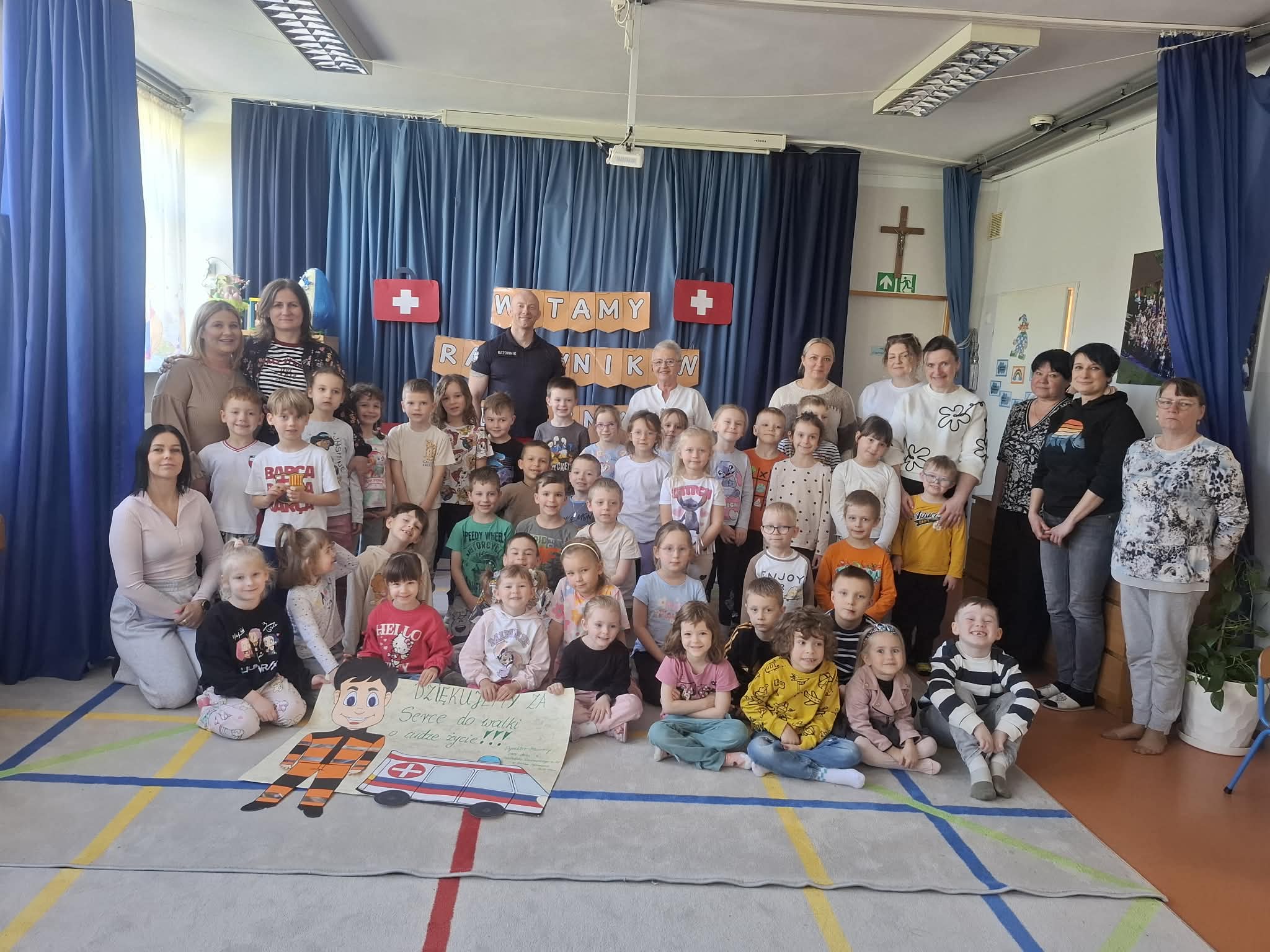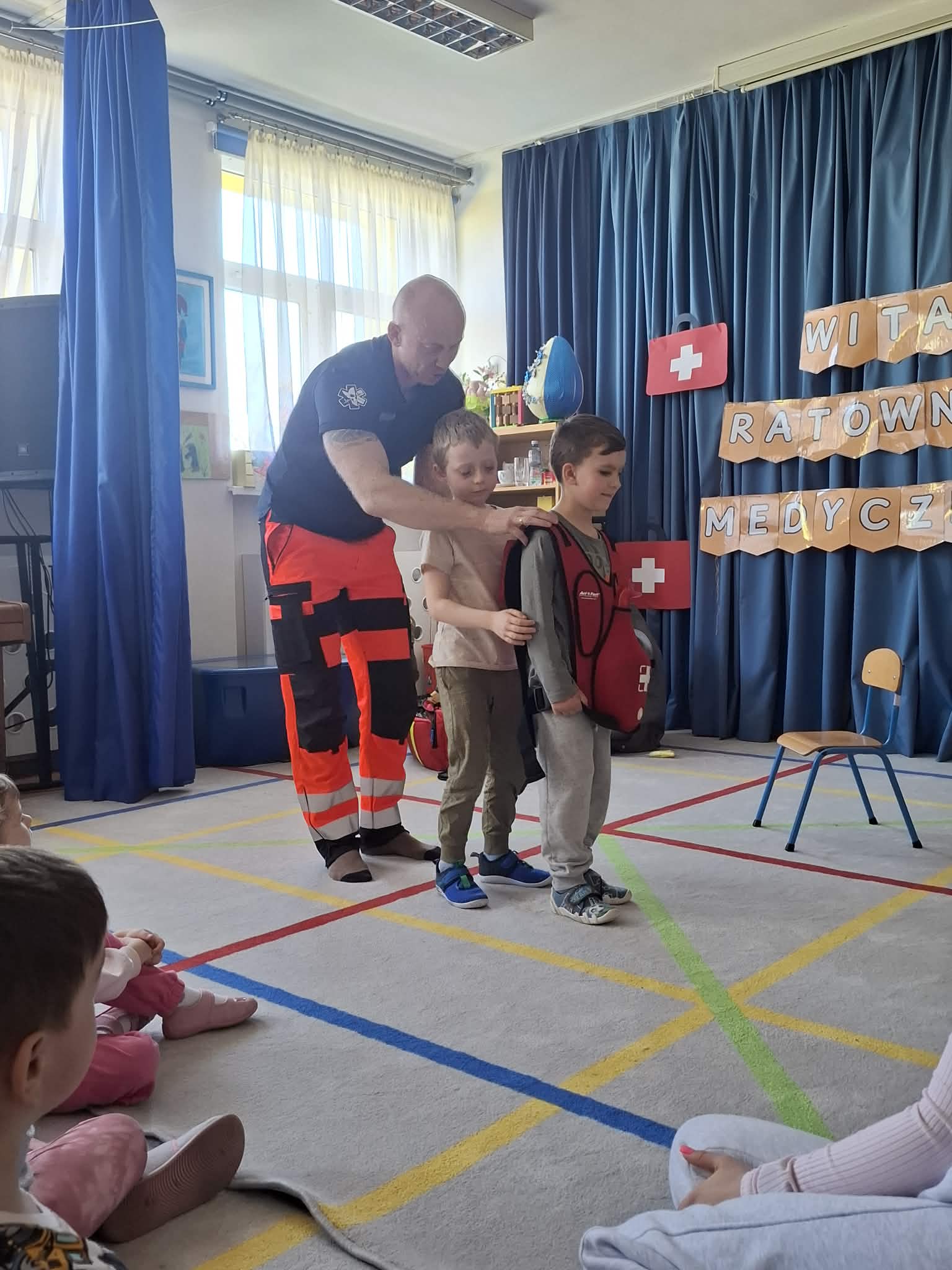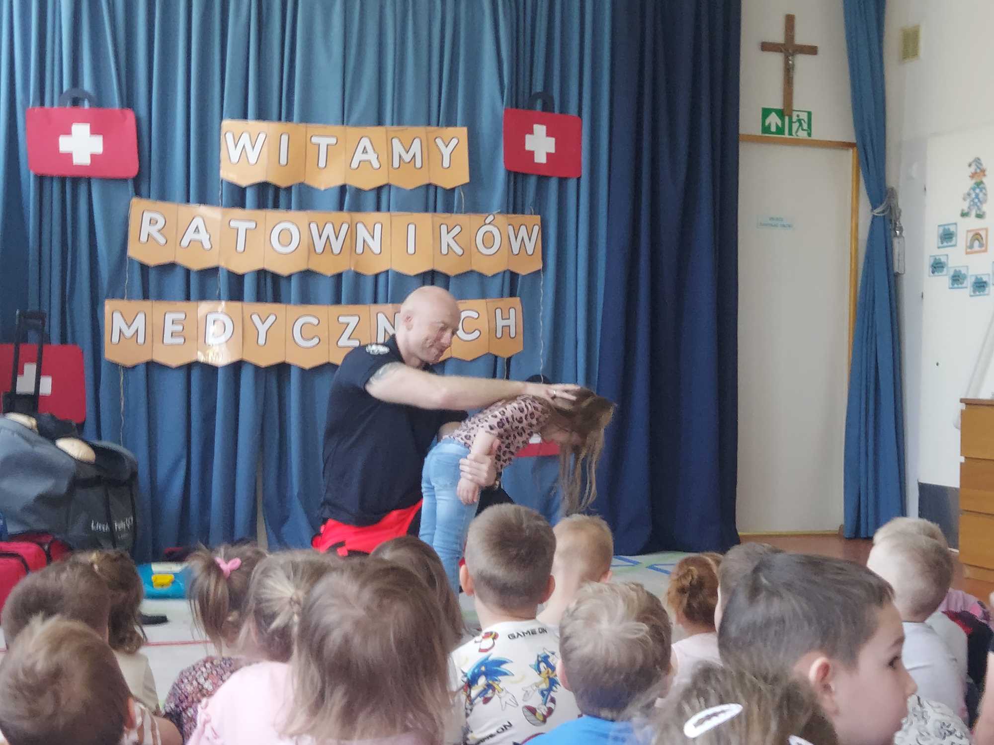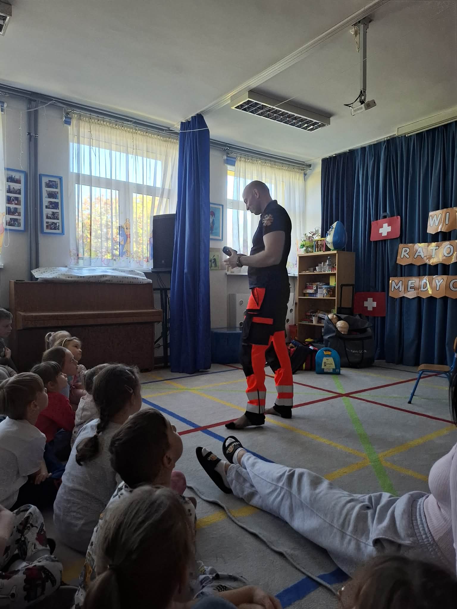 W naszym przedszkolu w dniu 23.04.2026 roku odbyło się wyjątkowe spotkanie z ratownikiem medycznym, który przybliżył dzieciom zasady udzielania pierwszej pomocy. Przedszkolaki dowiedziały się, jak zachować się w sytuacji zagrożenia oraz w jaki sposób wezwać pomoc. Gość zaprezentował podstawowe czynności ratunkowe, a dzieci mogły aktywnie uczestniczyć w pokazie. Największym zainteresowaniem cieszyła się możliwość obejrzenia sprzętu medycznego oraz ćwiczenia na fantomie. Spotkanie było nie tylko bardzo ciekawe, ale przede wszystkim pouczające i dostosowane do wieku dzieci. Dzięki tej wizycie przedszkolaki zdobyły cenną wiedzę, która może pomóc w sytuacjach zagrożenia zdrowia lub życia. To była niezwykle wartościowa lekcja bezpieczeństwa.