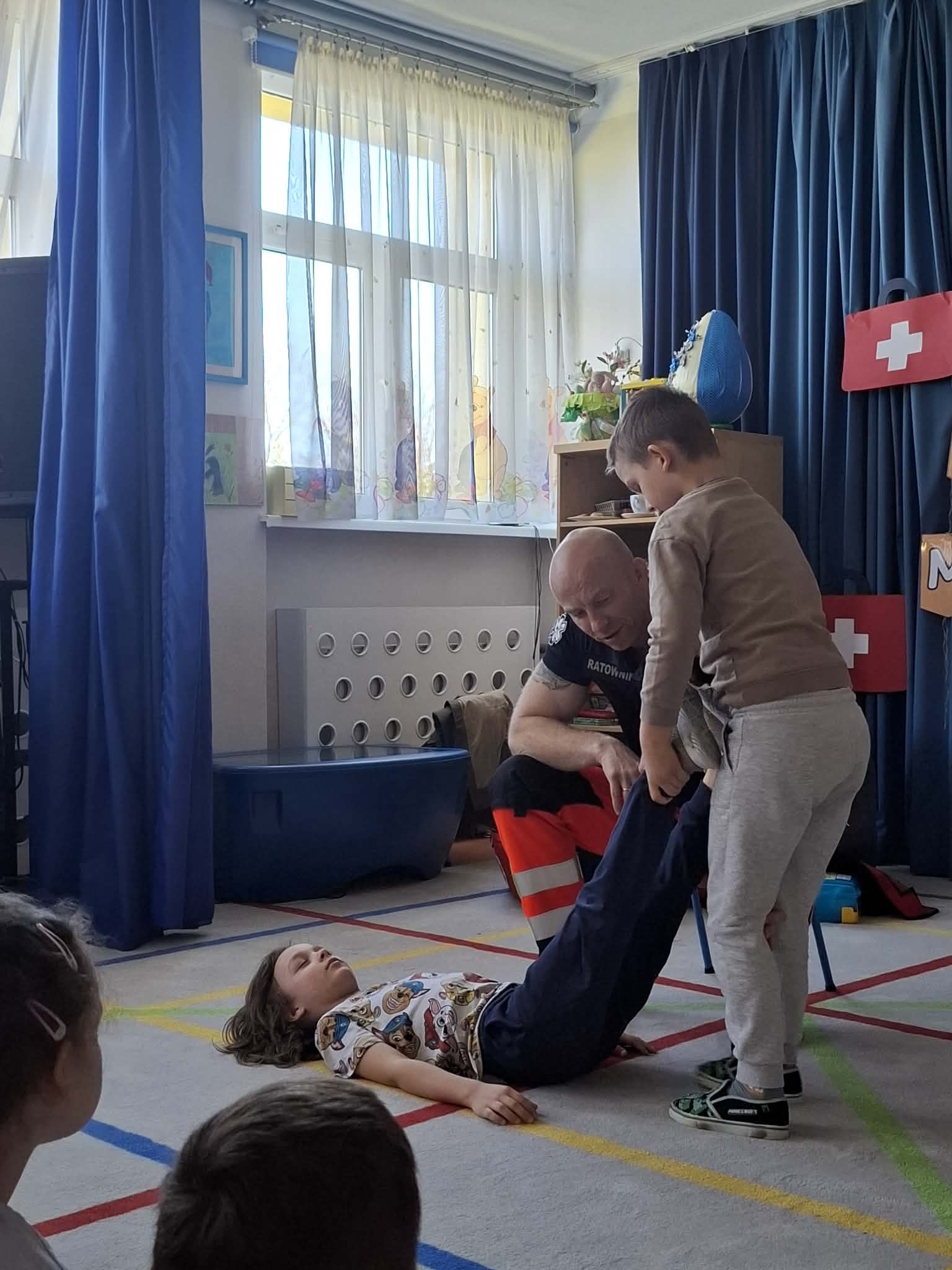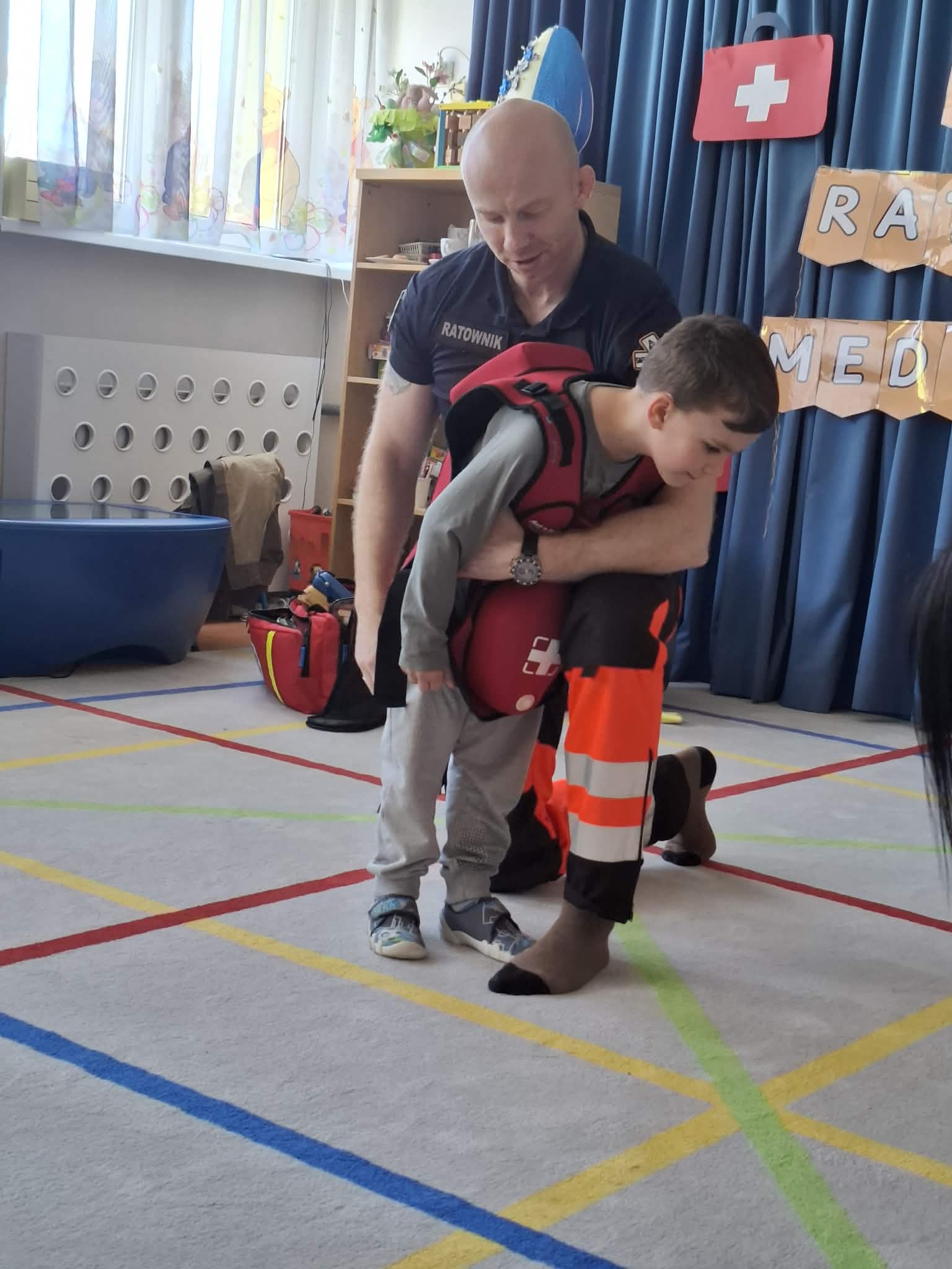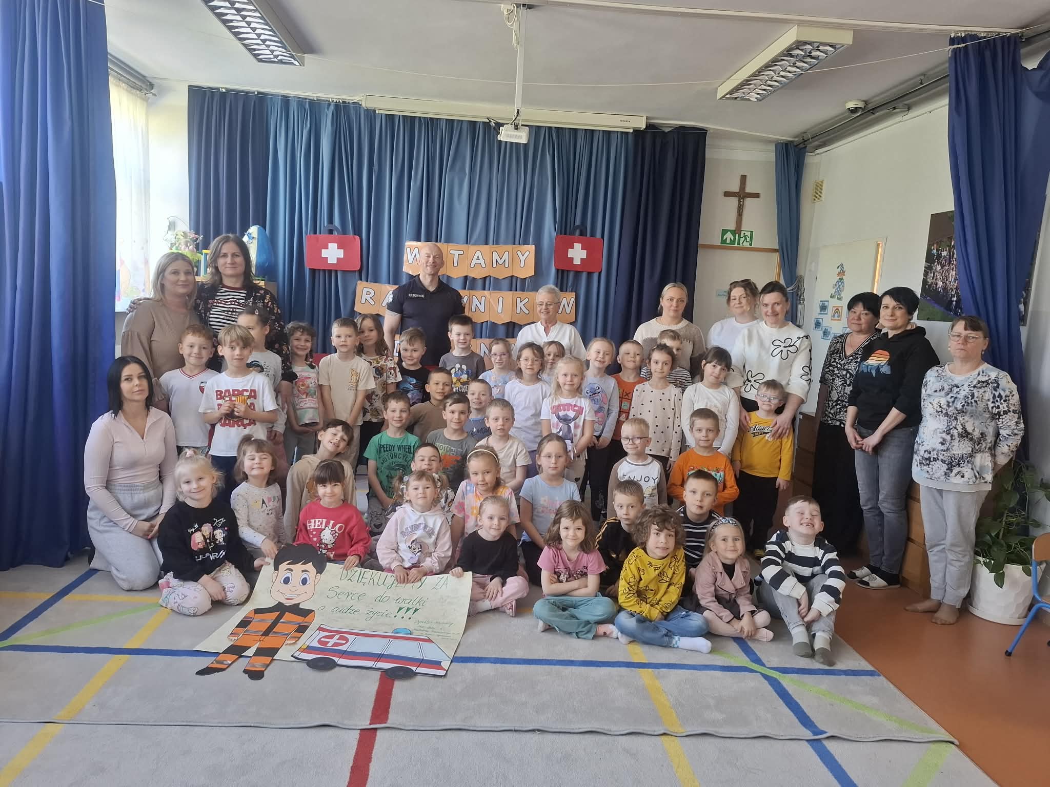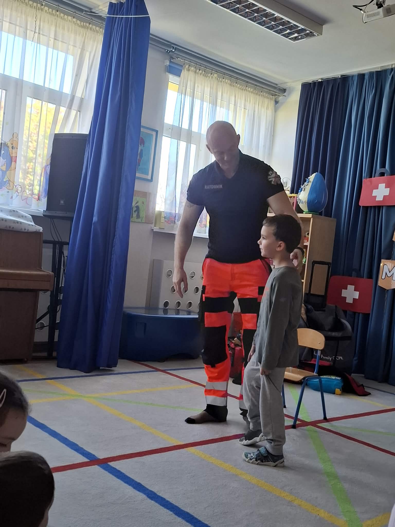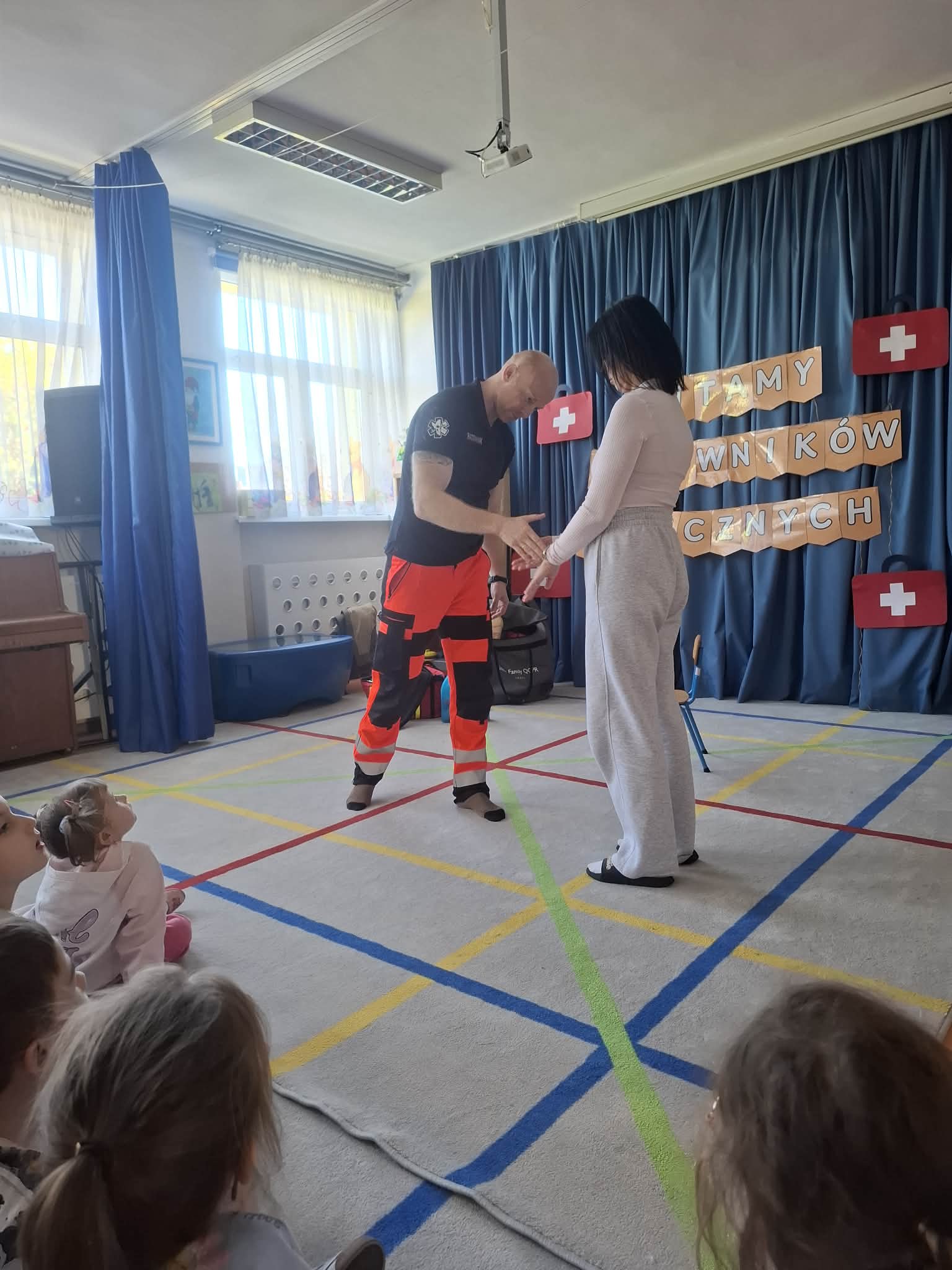 W naszym przedszkolu w dniu 23.04.2026 roku odbyło się wyjątkowe spotkanie z ratownikiem medycznym, który przybliżył dzieciom zasady udzielania pierwszej pomocy. Przedszkolaki dowiedziały się, jak zachować się w sytuacji zagrożenia oraz w jaki sposób wezwać pomoc. Gość zaprezentował podstawowe czynności ratunkowe, a dzieci mogły aktywnie uczestniczyć w pokazie. Największym zainteresowaniem cieszyła się możliwość obejrzenia sprzętu medycznego oraz ćwiczenia na fantomie. Spotkanie było nie tylko bardzo ciekawe, ale przede wszystkim pouczające i dostosowane do wieku dzieci. Dzięki tej wizycie przedszkolaki zdobyły cenną wiedzę, która może pomóc w sytuacjach zagrożenia zdrowia lub życia. To była niezwykle wartościowa lekcja bezpieczeństwa.