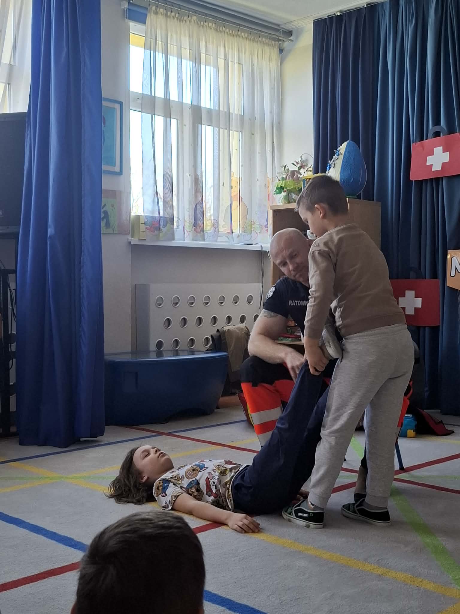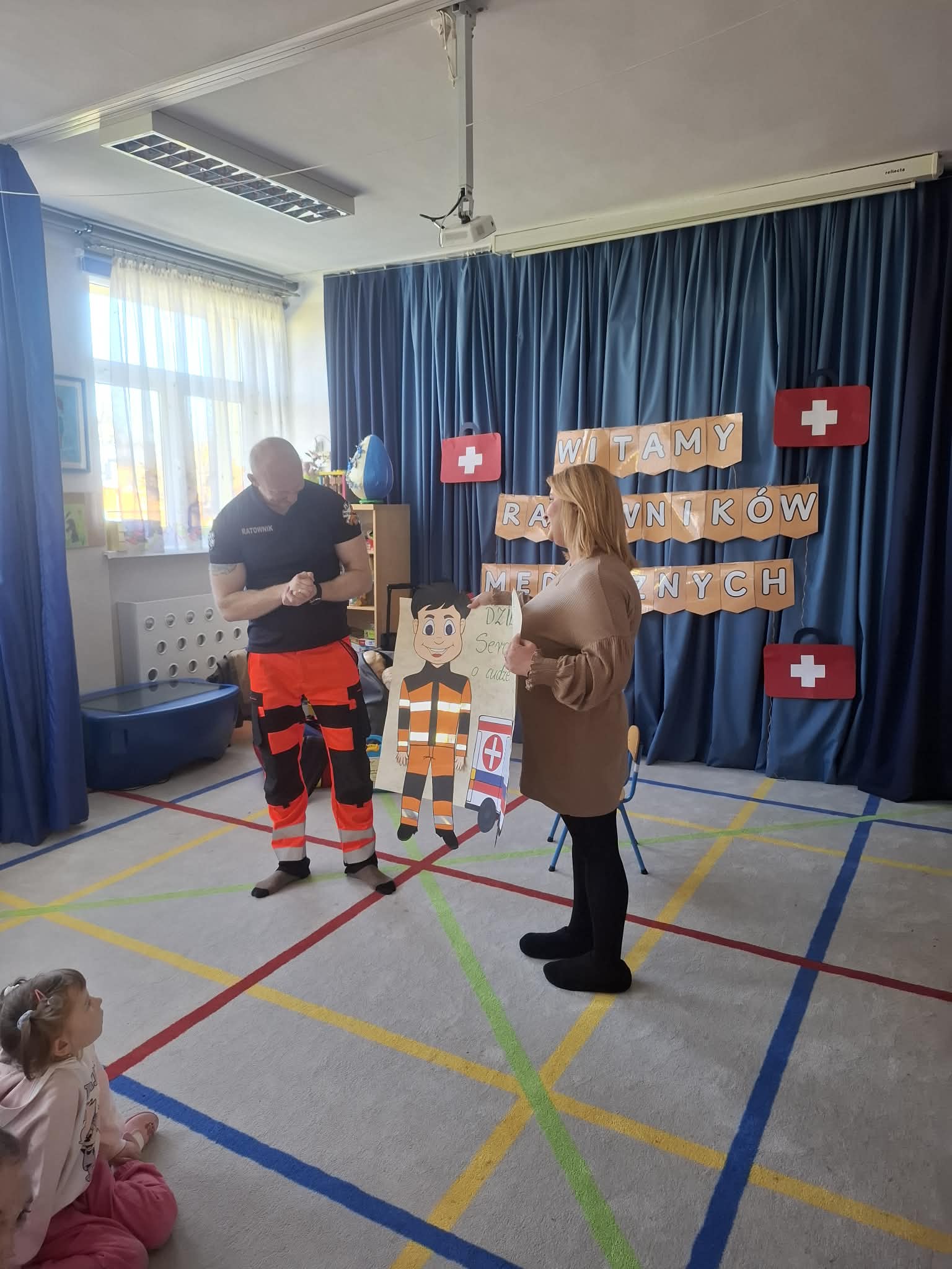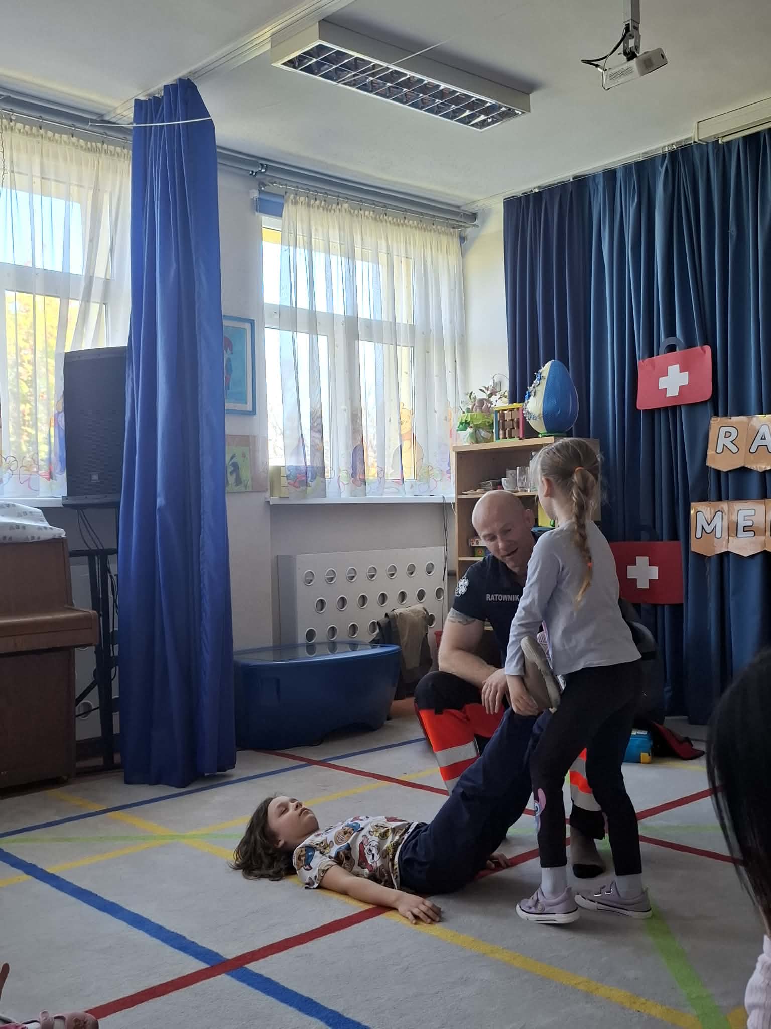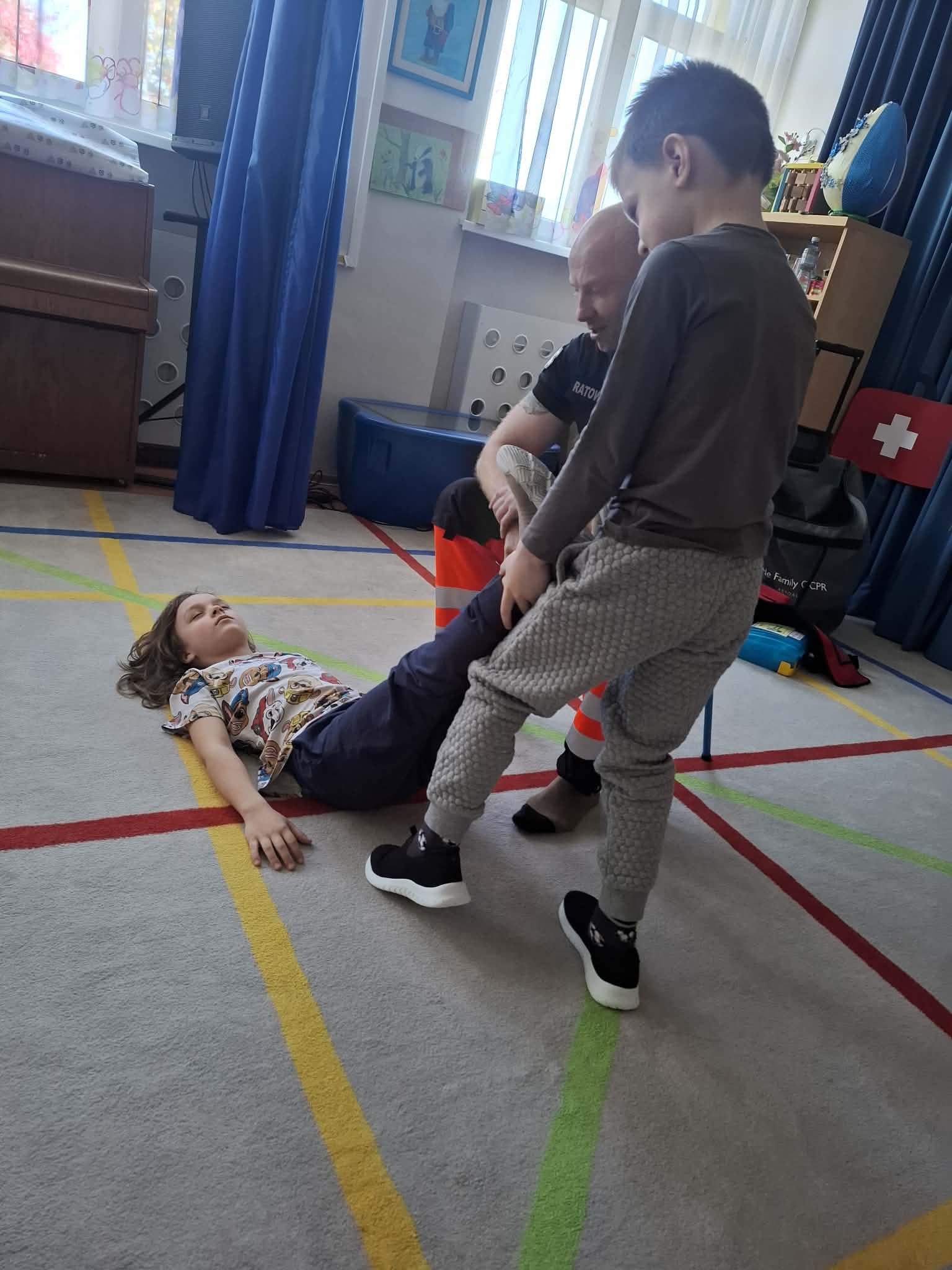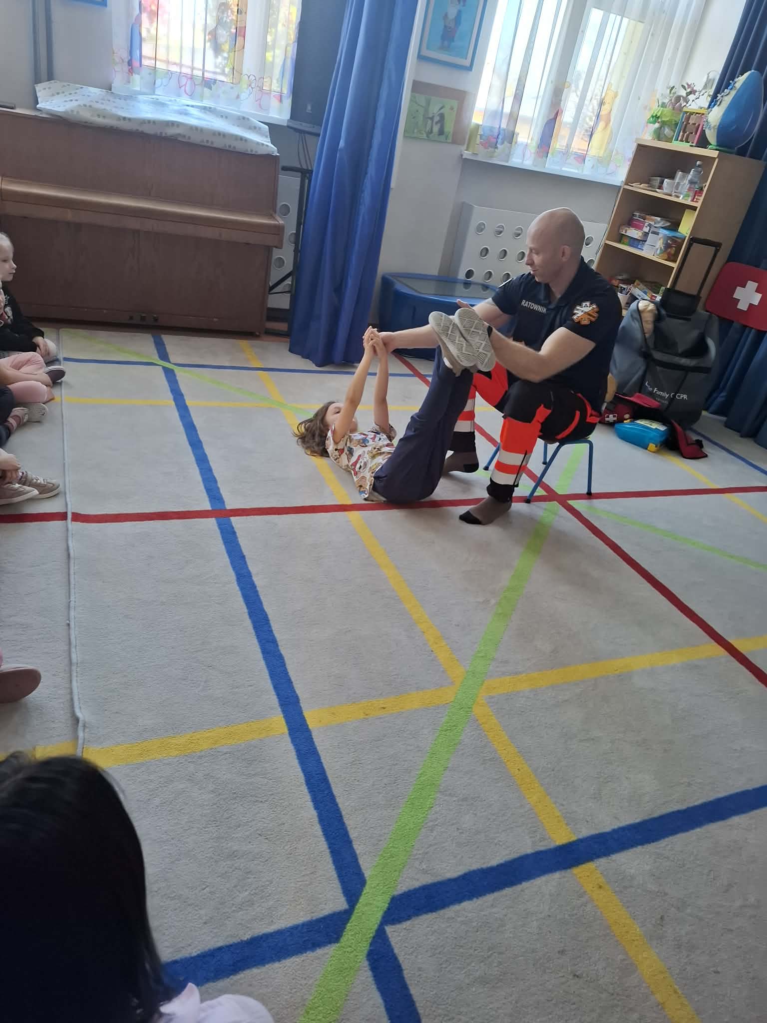 W naszym przedszkolu w dniu 23.04.2026 roku odbyło się wyjątkowe spotkanie z ratownikiem medycznym, który przybliżył dzieciom zasady udzielania pierwszej pomocy. Przedszkolaki dowiedziały się, jak zachować się w sytuacji zagrożenia oraz w jaki sposób wezwać pomoc. Gość zaprezentował podstawowe czynności ratunkowe, a dzieci mogły aktywnie uczestniczyć w pokazie. Największym zainteresowaniem cieszyła się możliwość obejrzenia sprzętu medycznego oraz ćwiczenia na fantomie. Spotkanie było nie tylko bardzo ciekawe, ale przede wszystkim pouczające i dostosowane do wieku dzieci. Dzięki tej wizycie przedszkolaki zdobyły cenną wiedzę, która może pomóc w sytuacjach zagrożenia zdrowia lub życia. To była niezwykle wartościowa lekcja bezpieczeństwa.