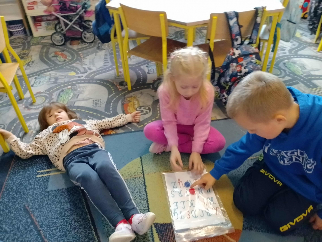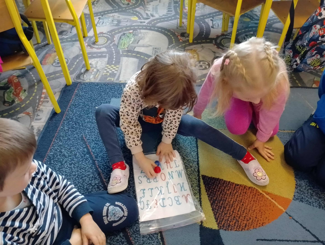 Zabawa polegała na przesuwaniu umieszczonych pod folią pomponików, tak aby zostały ułożone na konkretnej literze. Zabawa bardzo nam się podobała.