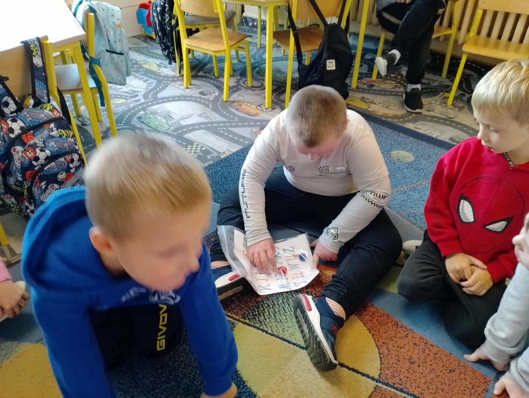 Zabawa manualna, podczas której nie tylko ćwiczyliśmy drobne mięśnie palców, ale także cierpliwość, koncentrację uwagi oraz utrwalaliśmy poznane litery.