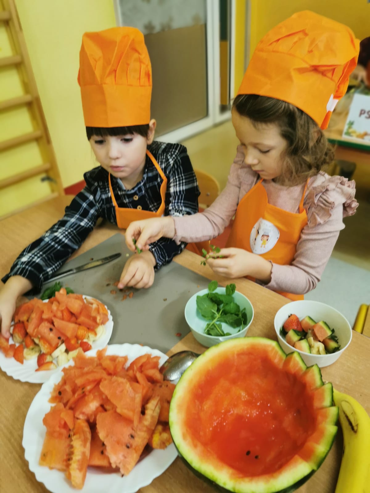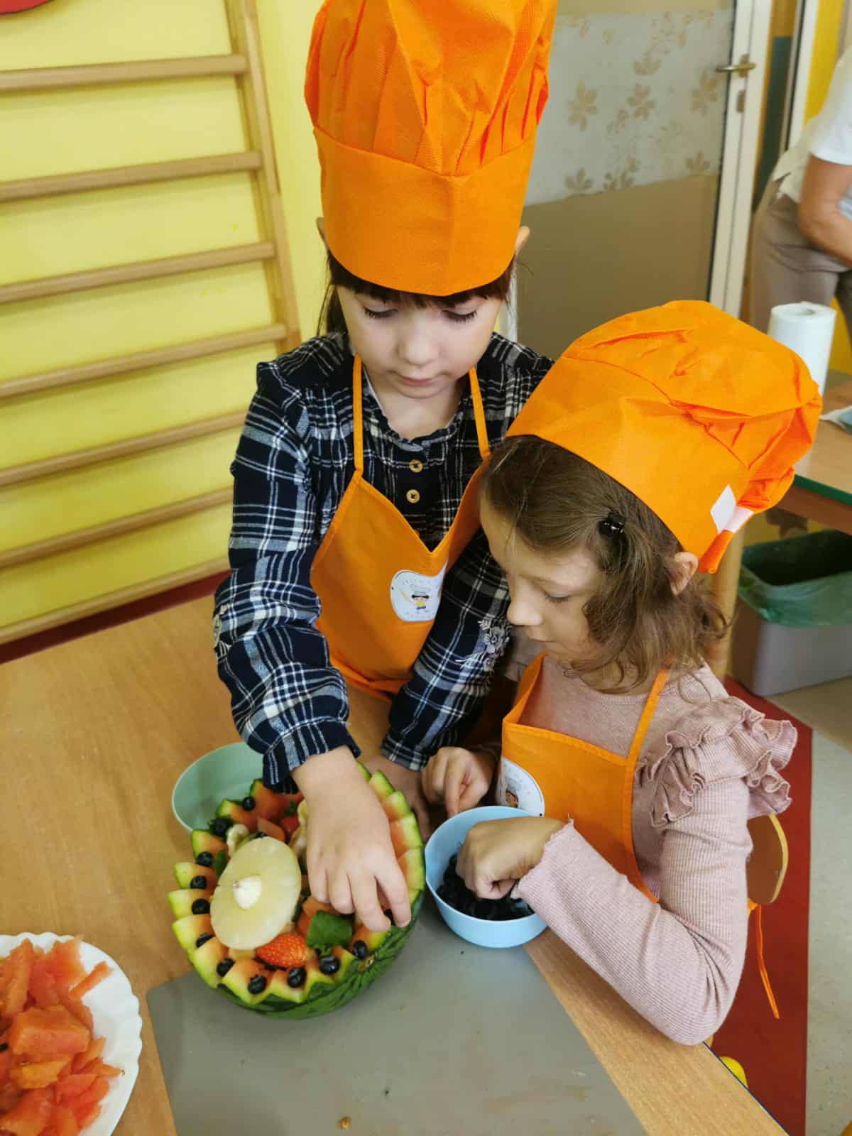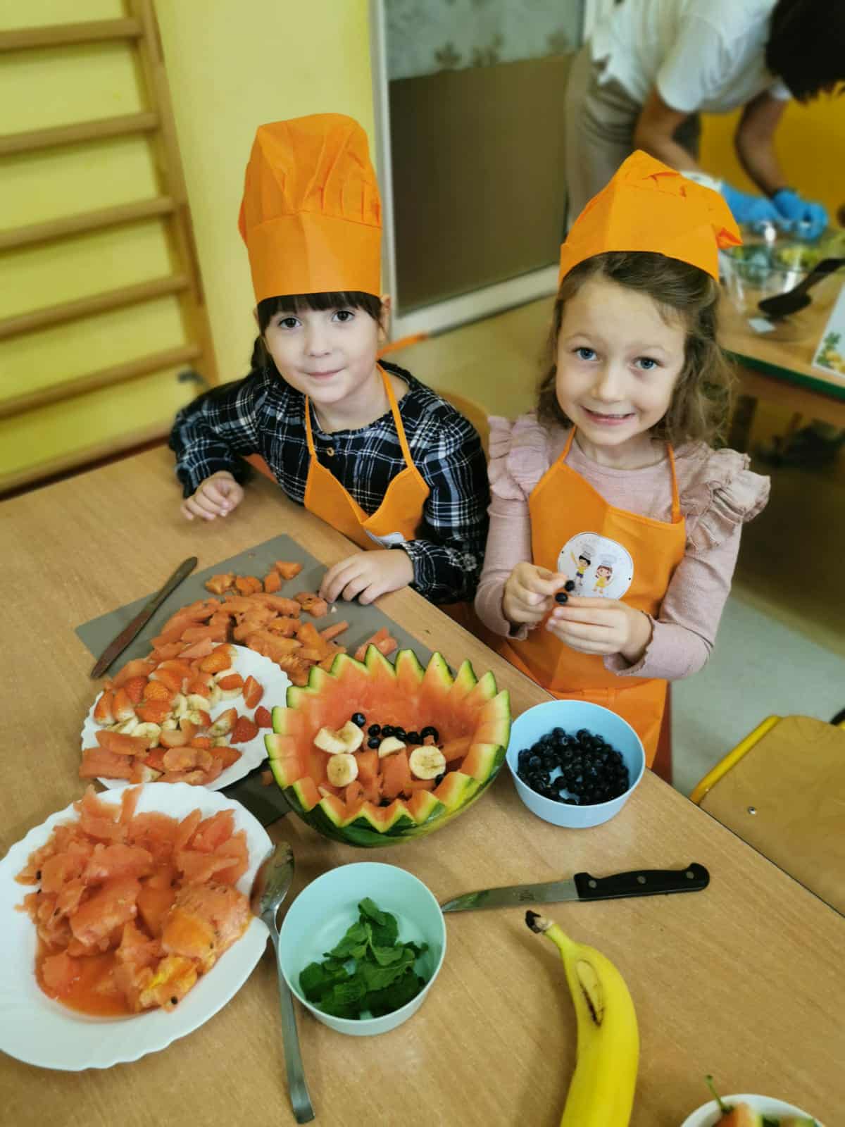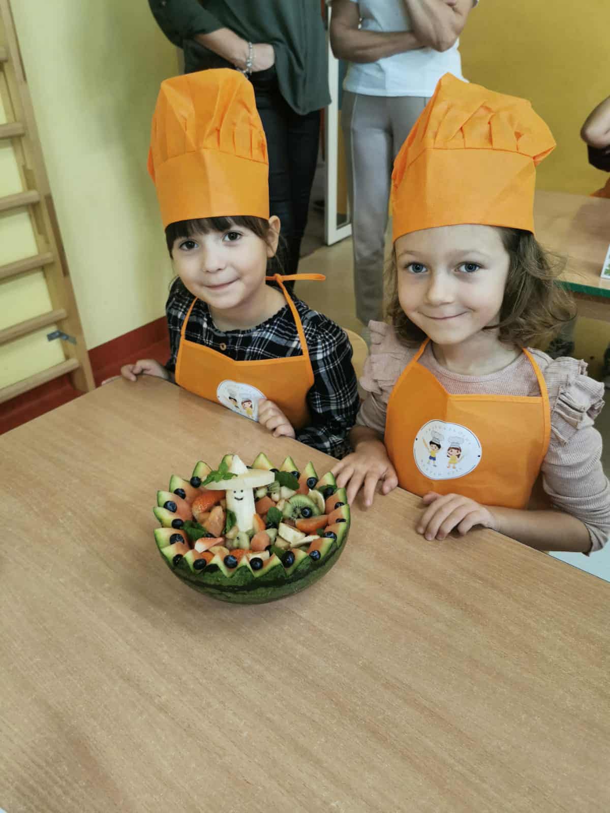 Zosia i Zuzia z grupy III wzięły udział w międzyprzedszkolnym konkursie kulinarnym, podczas którego przygotowały przepyszną sałatkę owocową podaną w misce z arbuza. Ich pomysłowość, zaangażowanie i estetyczne wykonanie potrawy zostały docenione przez jury – dziewczynki zdobyły wyróżnienie!