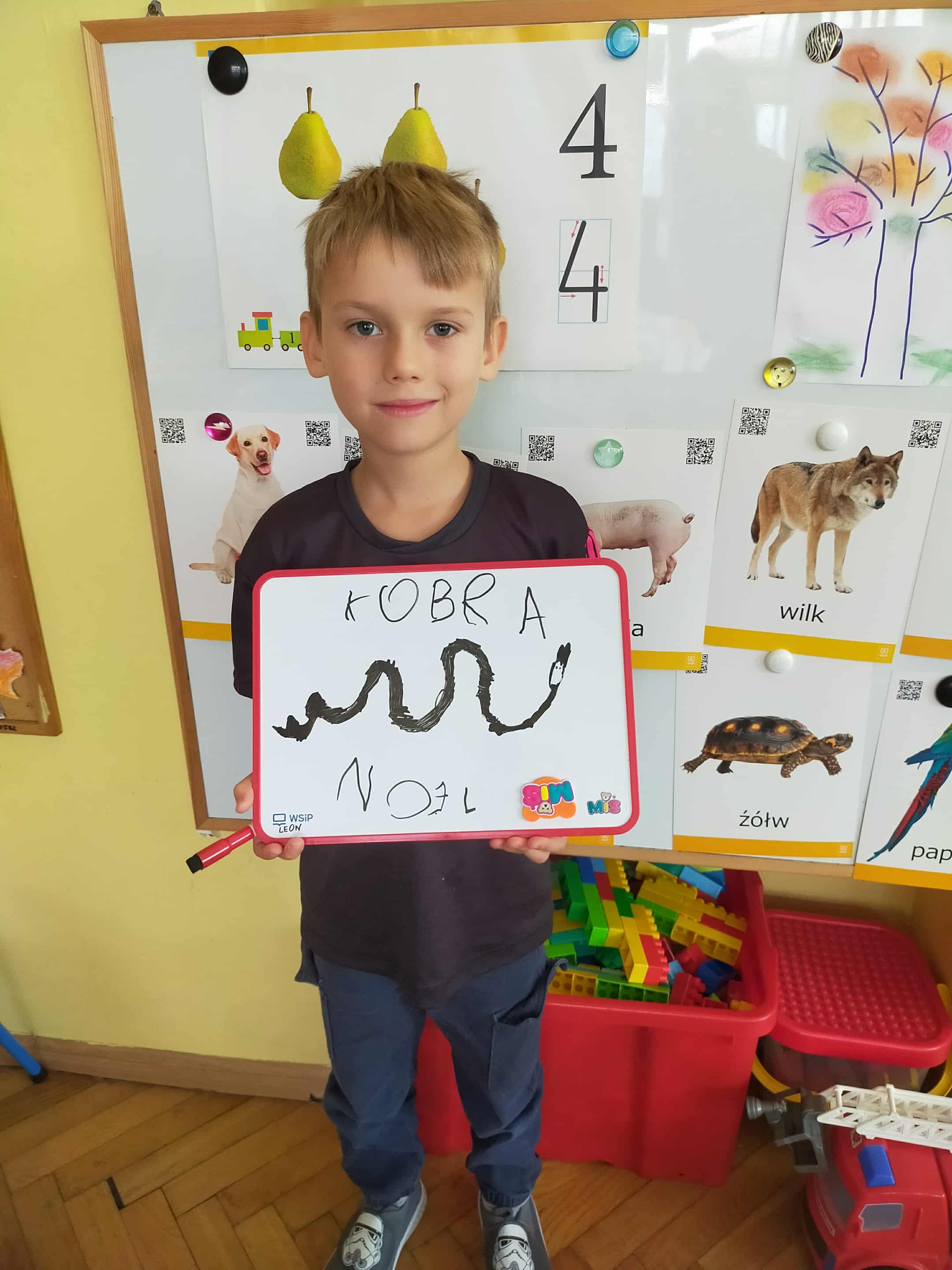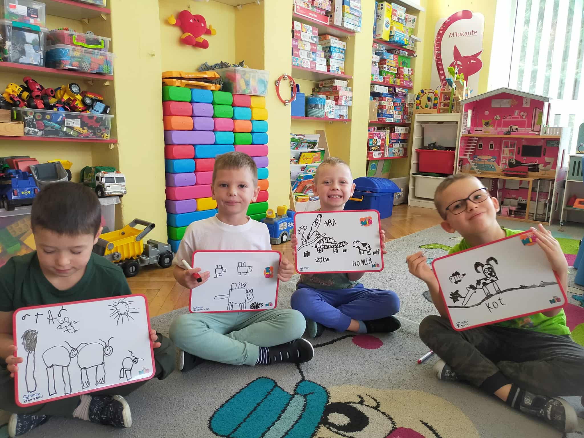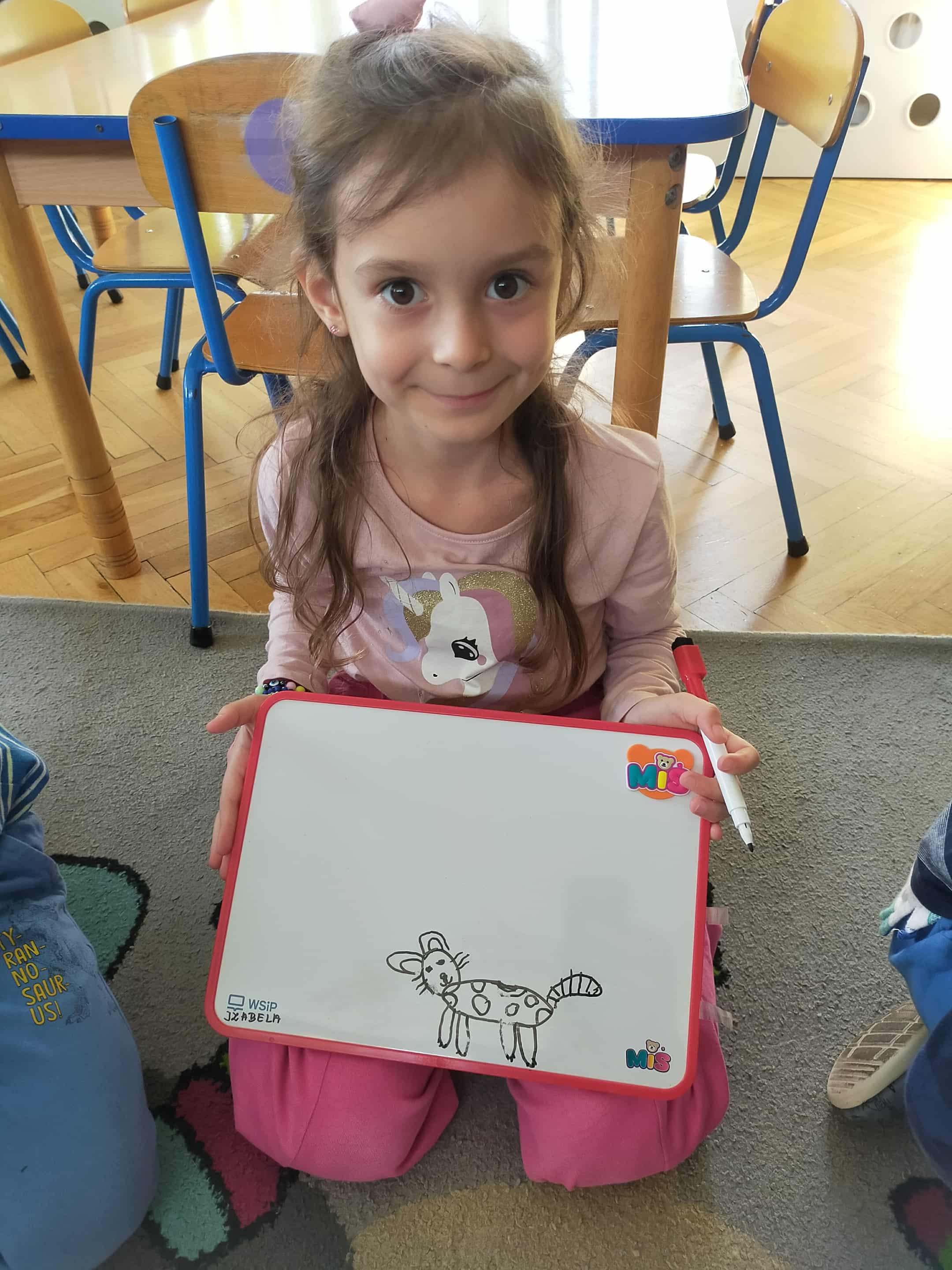 Dzieci z grupy "Zajączki" z zaangażowaniem pracowały na tablicach magnetycznych, rozwijając swoją wiedzę na temat zwierząt. Podczas zajęć rozpoznawały różne gatunki, omawiały ich cechy oraz środowisko życia. Następnie samodzielnie rysowały zwierzęta na tablicach, ćwicząc przy tym spostrzegawczość, koordynację wzrokowo-ruchową i kreatywność. Zajęcia połączyły naukę z zabawą, pozwalając dzieciom w atrakcyjny sposób utrwalać nowe informacje o świecie przyrody.