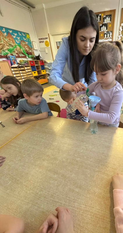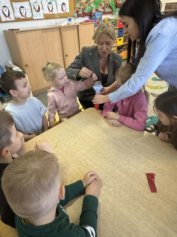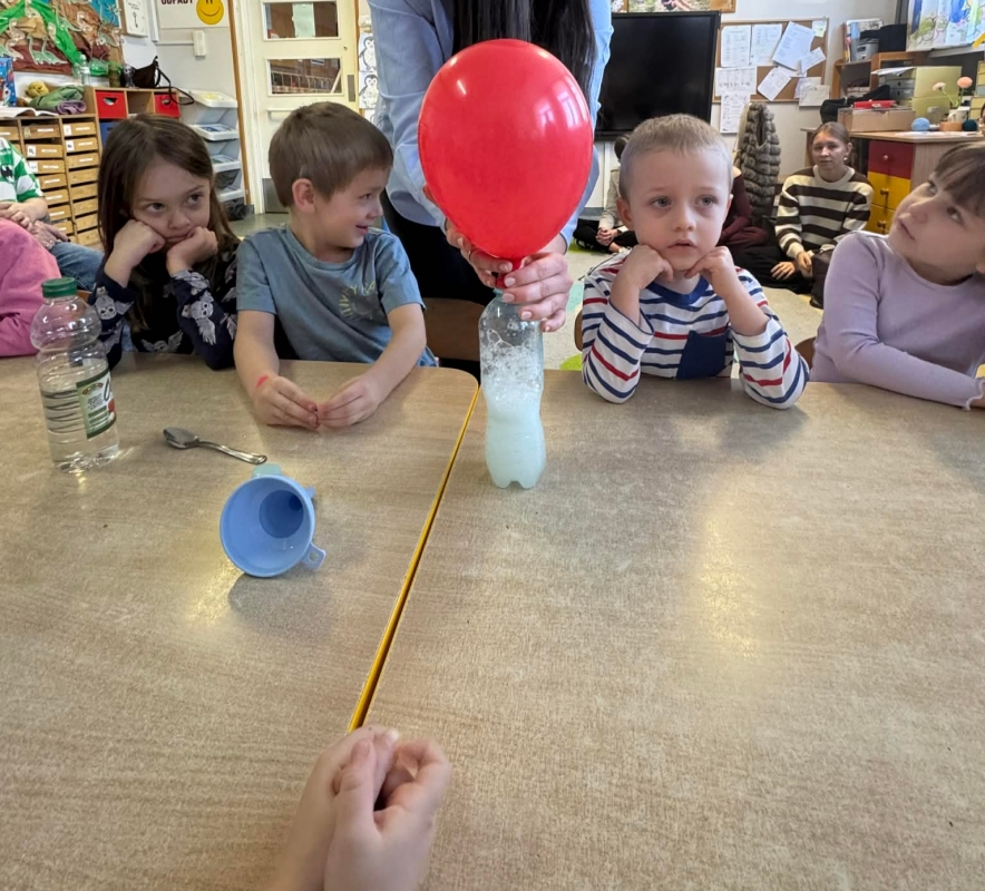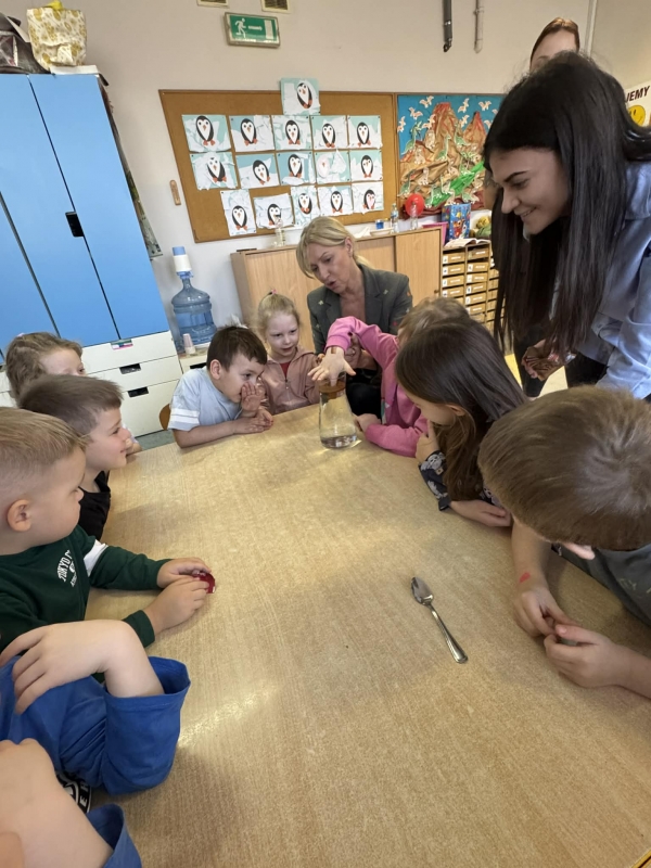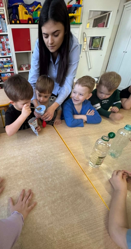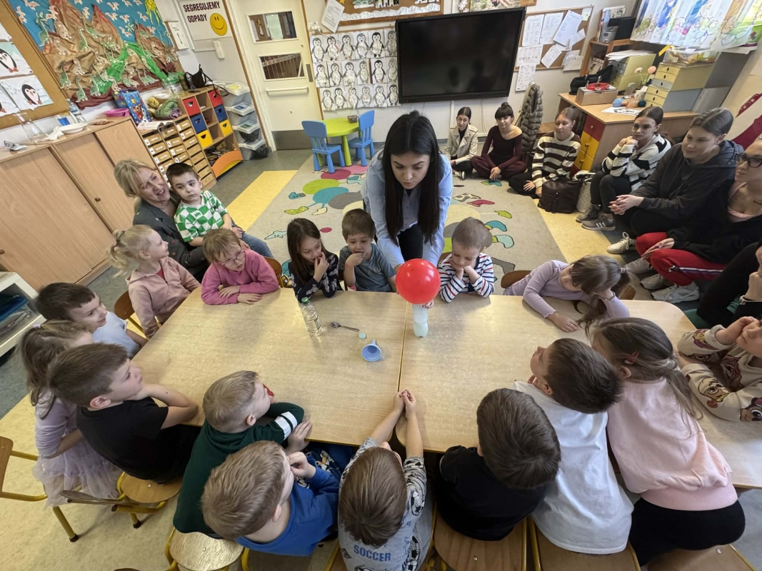 Dzieci z gr. II bardzo lubią eksperymentować. W naszych zajęciach uczestniczyły studentki z Akademii Piotrkowskiej, odbywające w naszej placówce praktyki i obserwujące pracę z dziećmi. Podczas zajęć dzieci miały okazję wziąć udział w kilku interesujących doświadczeniach. Pierwszym z nich był „samopompujący się balon”. Dzieci wsypały do balonu sodę oczyszczoną, natomiast do butelki został wlany ocet. Po połączeniu składników balon zaczął się sam napełniać, co wzbudziło wśród dzieci duże zdziwienie i radość. Kolejnym eksperymentem było doświadczenie ze świeczką ustawioną na wodzie. Po zapaleniu świeczki została ona przykryta słoikiem, co odcięło dopływ tlenu. Po chwili płomień zgasł, a woda zaczęła podnosić się do środka słoika, tworząc ciekawy efekt. Dzieci obserwowały również eksperyment z wodą i cynamonem. Najpierw wkładały palec do wody i był on mokry. Następnie na powierzchnię wody został wsypany cynamon. Ku zaskoczeniu dzieci, gdy ponownie dotknęły wody, palec pozostał suchy. Zajęcia dostarczyły dzieciom wielu emocji, radości oraz nowych doświadczeń, a możliwość obserwowania eksperymentów była dla nich niezwykle ciekawym przeżyciem.