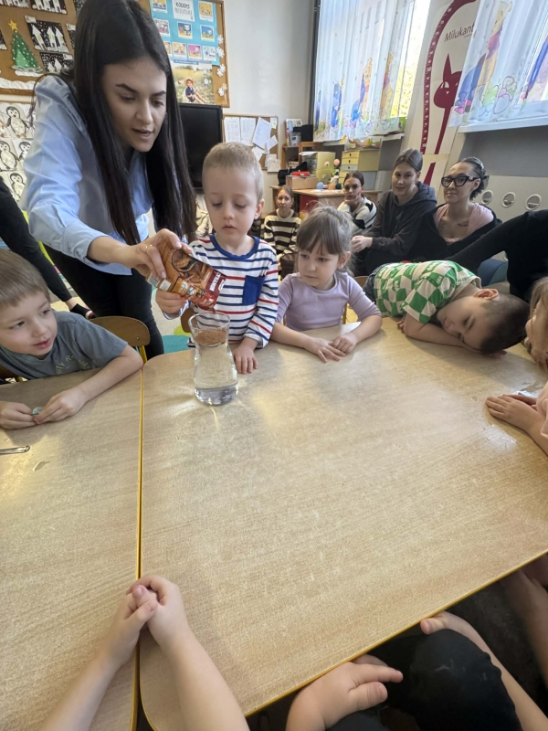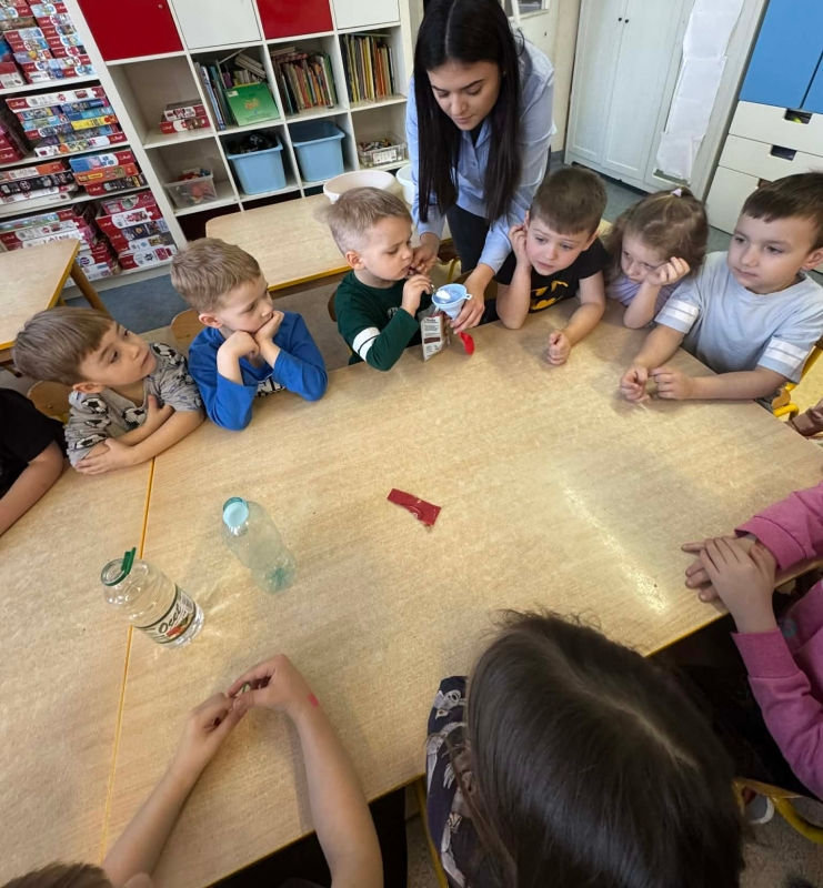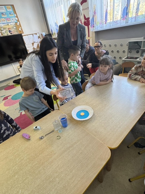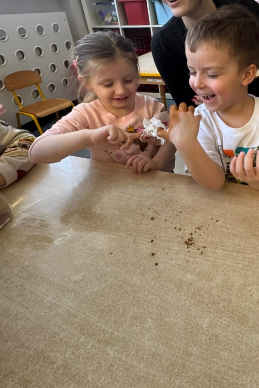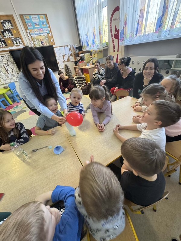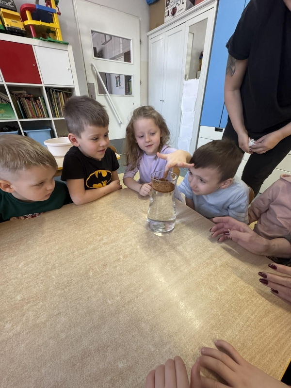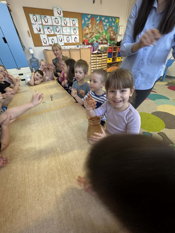 Dzieci z gr. II bardzo lubią eksperymentować. W naszych zajęciach uczestniczyły studentki z Akademii Piotrkowskiej, odbywające w naszej placówce praktyki i obserwujące pracę z dziećmi. Podczas zajęć dzieci miały okazję wziąć udział w kilku interesujących doświadczeniach. Pierwszym z nich był „samopompujący się balon”. Dzieci wsypały do balonu sodę oczyszczoną, natomiast do butelki został wlany ocet. Po połączeniu składników balon zaczął się sam napełniać, co wzbudziło wśród dzieci duże zdziwienie i radość. Kolejnym eksperymentem było doświadczenie ze świeczką ustawioną na wodzie. Po zapaleniu świeczki została ona przykryta słoikiem, co odcięło dopływ tlenu. Po chwili płomień zgasł, a woda zaczęła podnosić się do środka słoika, tworząc ciekawy efekt. Dzieci obserwowały również eksperyment z wodą i cynamonem. Najpierw wkładały palec do wody i był on mokry. Następnie na powierzchnię wody został wsypany cynamon. Ku zaskoczeniu dzieci, gdy ponownie dotknęły wody, palec pozostał suchy. Zajęcia dostarczyły dzieciom wielu emocji, radości oraz nowych doświadczeń, a możliwość obserwowania eksperymentów była dla nich niezwykle ciekawym przeżyciem.