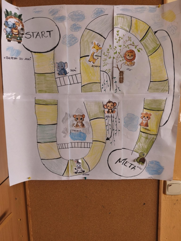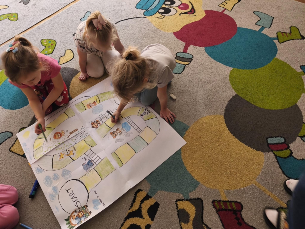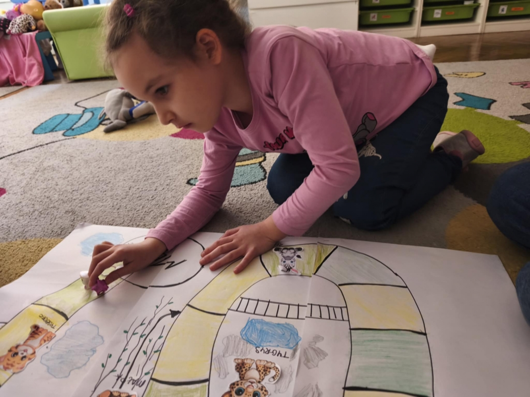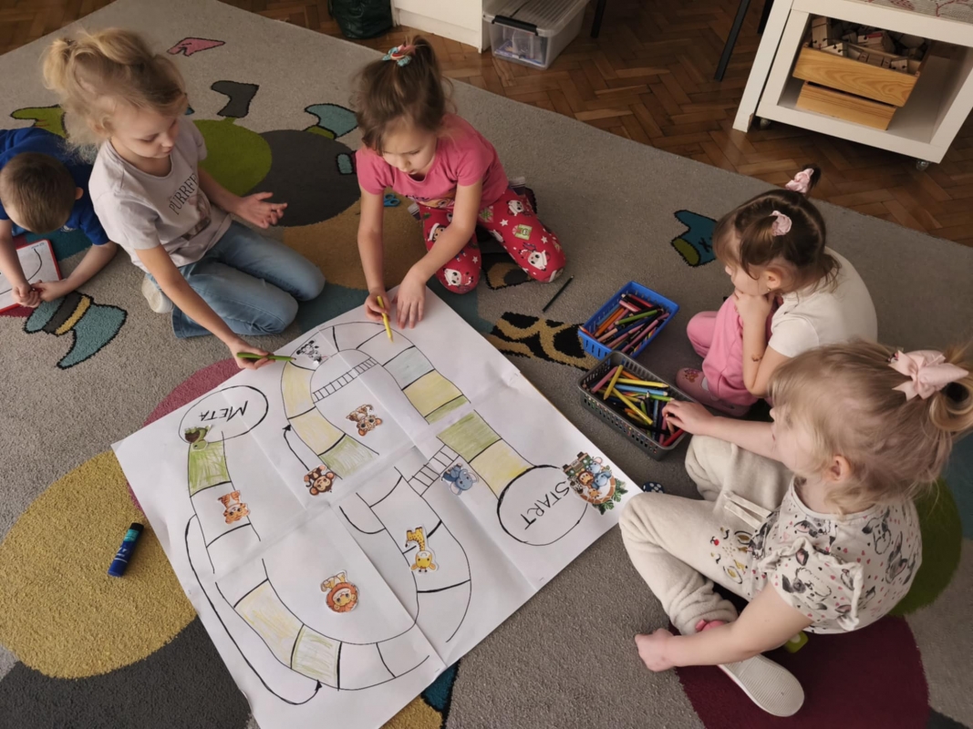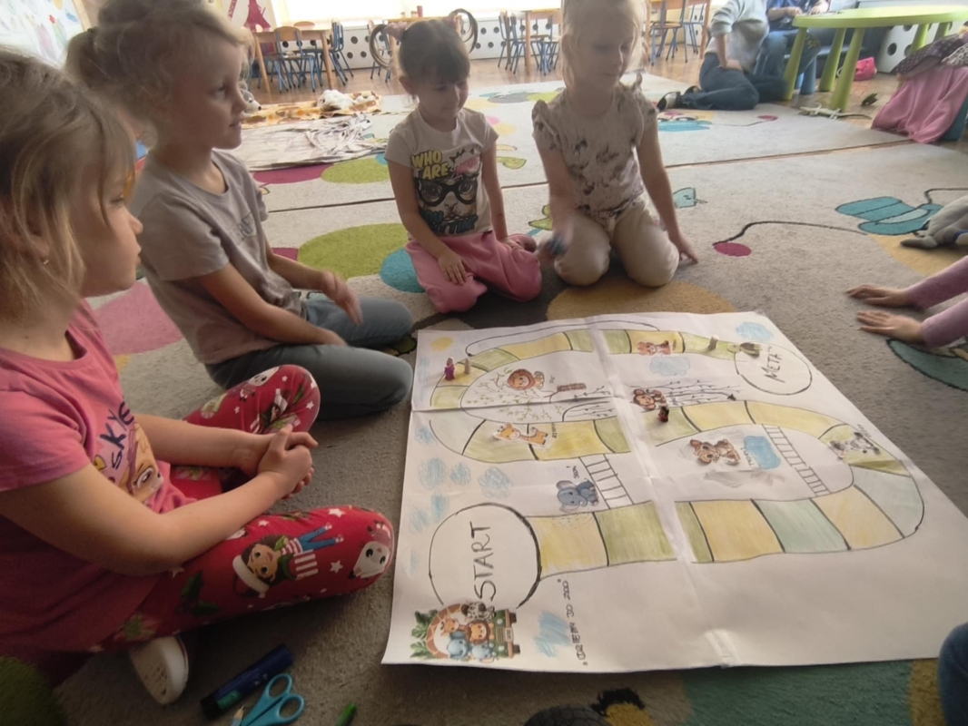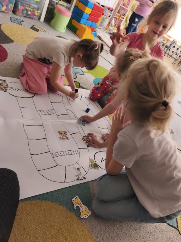 W dniu 20.02 grupa "Pajacyki" wraz z Ciocią Karoliną stworzyła grę planszową XXL pt. "Idziemy do zoo" dzieci same kolorowały pola planszy przyklejały zwierzątka, które można zobaczyć w zoo i dorysowywały elementy przyrody przedszkolaki wymyśliły własne zasady gry była to fantastyczna zabawa, dzięki której dzieci mogły nauczyć się czym są wygrana i przegrana.