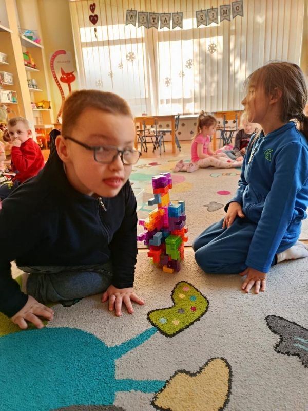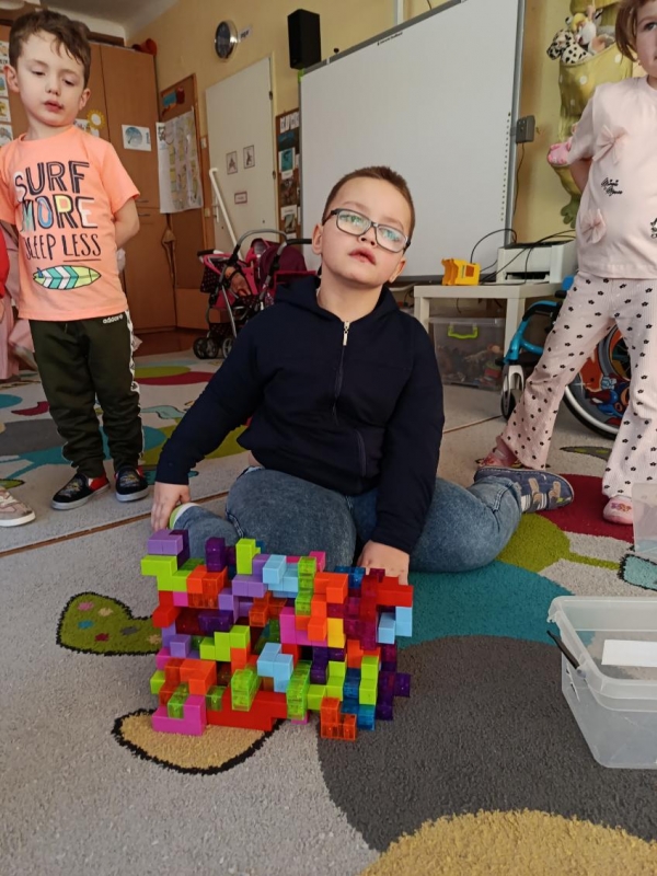 W trakcie swobodnych zabaw konstrukcyjnych dzieci prezentowały również swoje talenty i zdolności w obszarze budowania z klocków magnetycznych. Tworzyły różnorodne konstrukcje przestrzenne, wykazując się pomysłowością, wyobraźnią oraz umiejętnością planowania i współpracy. Zajęcia sprzyjały rozwijaniu kreatywności, myślenia przestrzennego oraz zdolności manualnych.