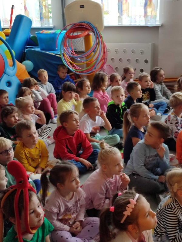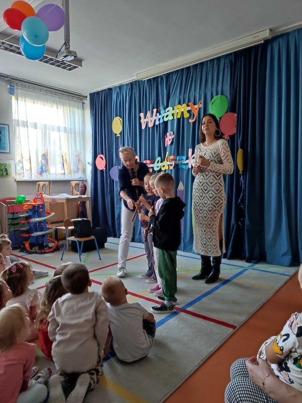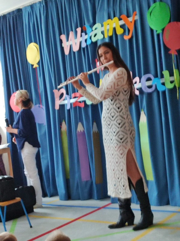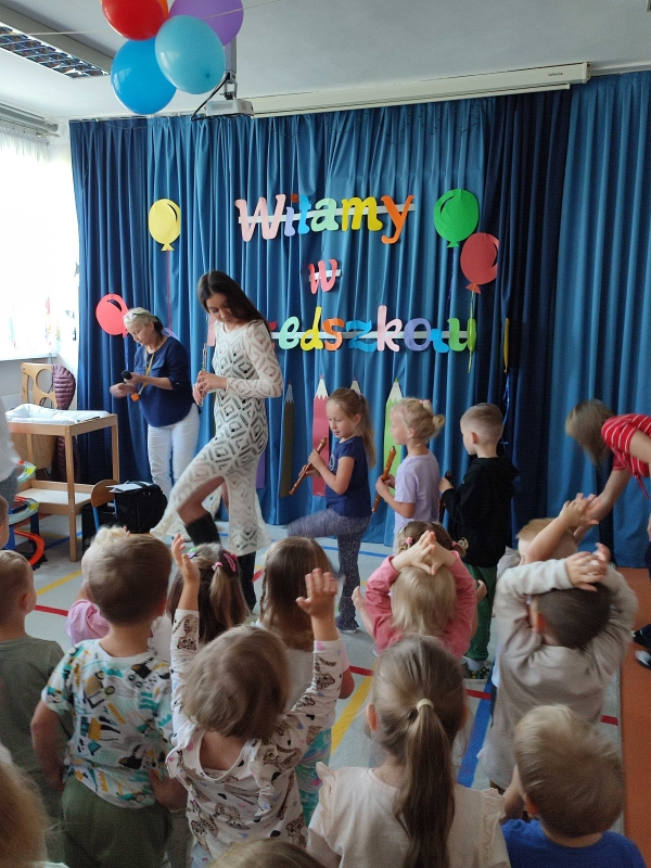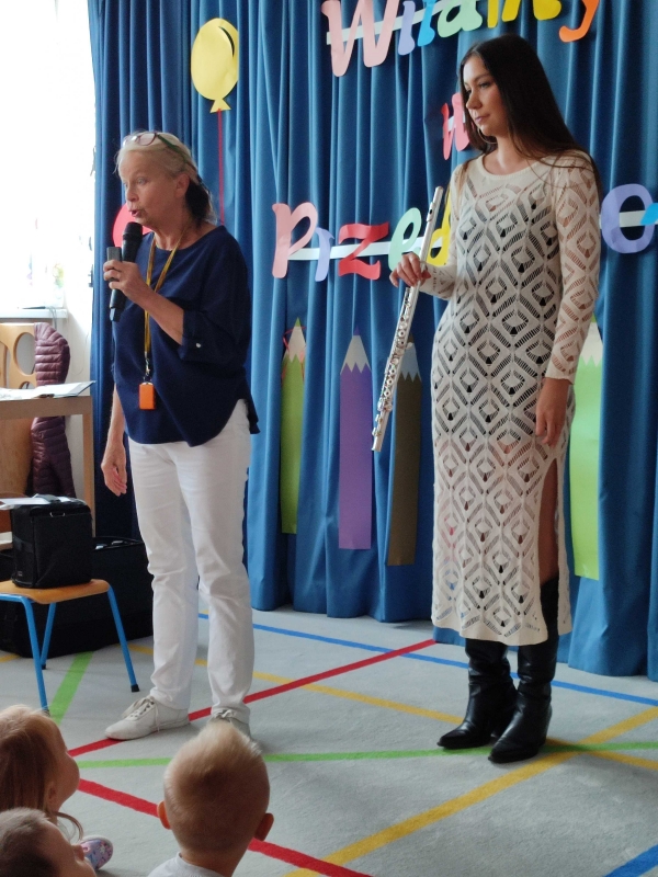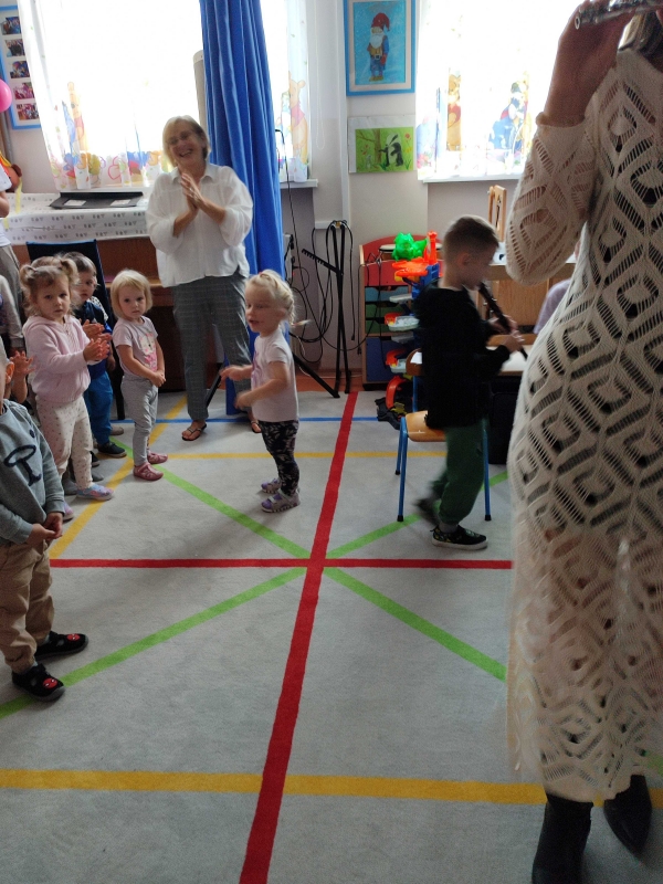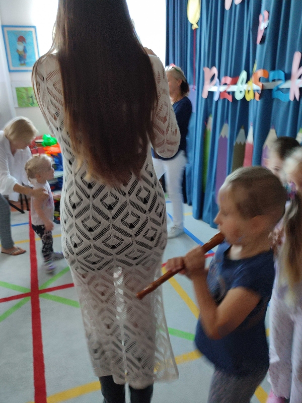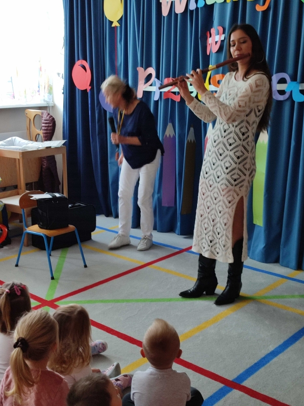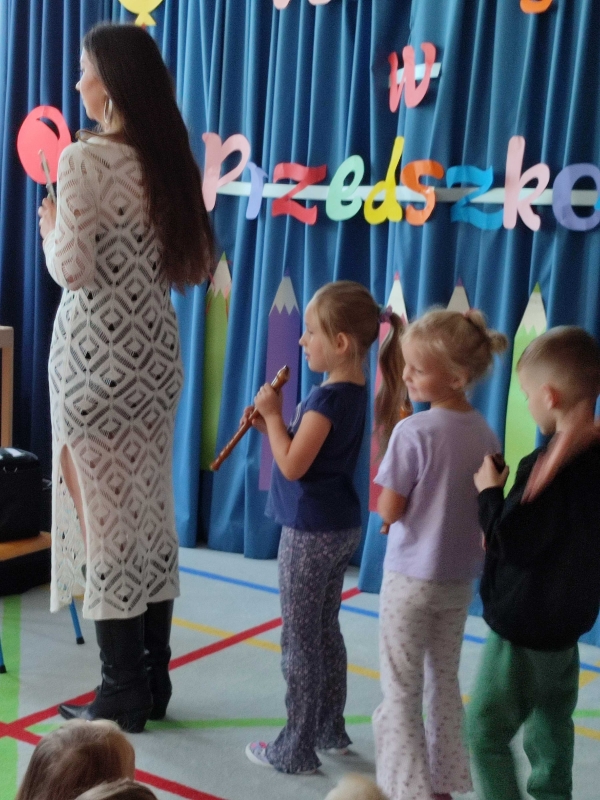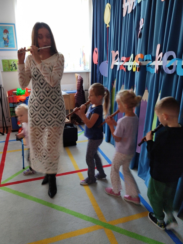 Dzisiaj po raz pierwszy w tym roku szkolnym dzieci uczestniczyły w audycji muzycznej. Przedszkolaki zapoznały się z różnymi rodzajami fletów, mogły samodzielnie grać na wybranym instrumencie.