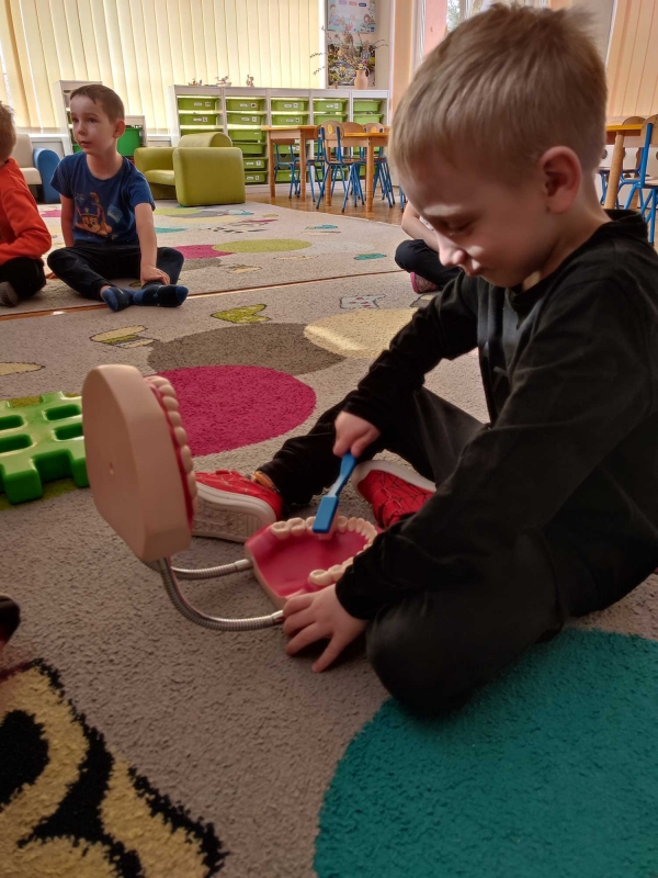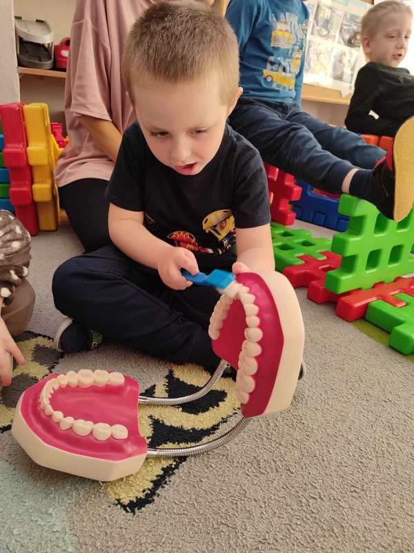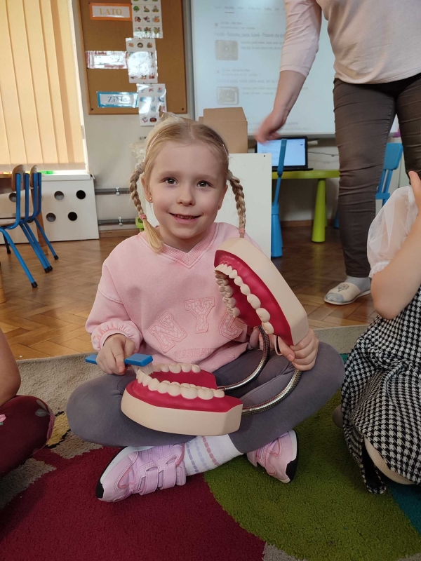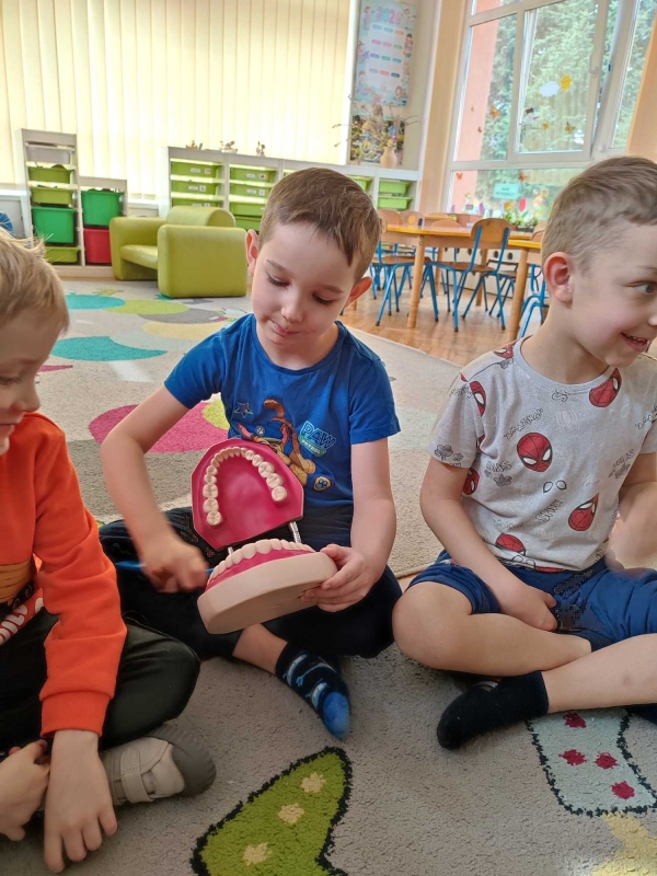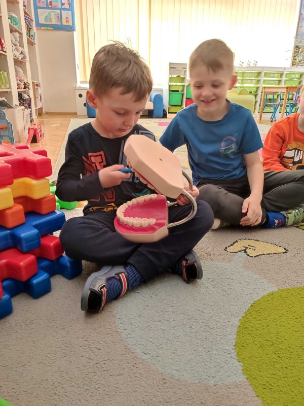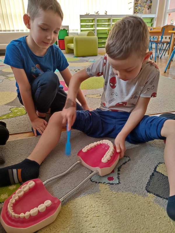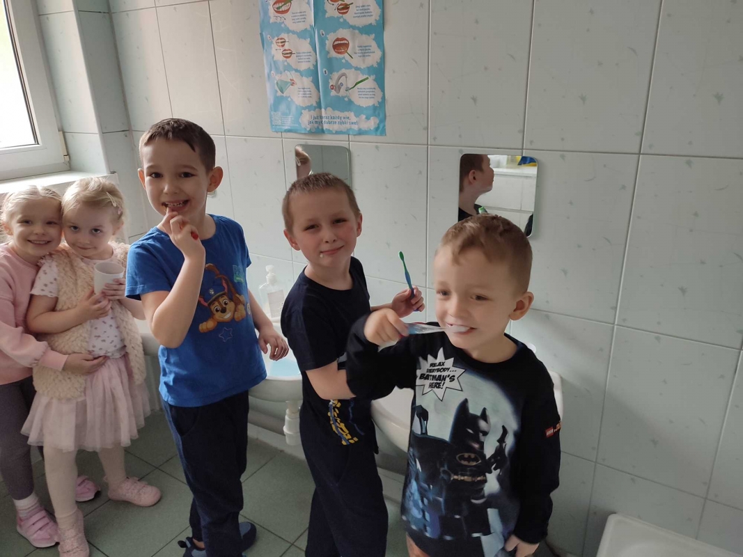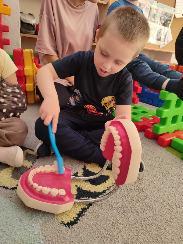 Dzieci z grupy V rozmawiały o znaczeniu higieny jamy ustnej oraz o tym, jak prawidłowo dbać o zęby. Przypomniały sobie, jak ważne jest regularne mycie zębów oraz jakie produkty pomagają utrzymać zdrowy i piękny uśmiech. Dzieci obejrzały również film edukacyjny z serii ,,Środa z profilaktyką'' pt. ,,Jak prawidłowo dbać o higienę jamy ustnej''. Przedszkolaki miały także możliwość wyszczotkowania sztucznej szczęki. Nie obyło się także bez aktywności plastycznej, podczas której dzieci malowały szczotki, pasty i ząbki. Zajęcia miały na celu kształtkowanie prawidłowych nawyków higienicznych oraz dbania o zdrowie. Były to pouczające i ciekawe zajęcia.