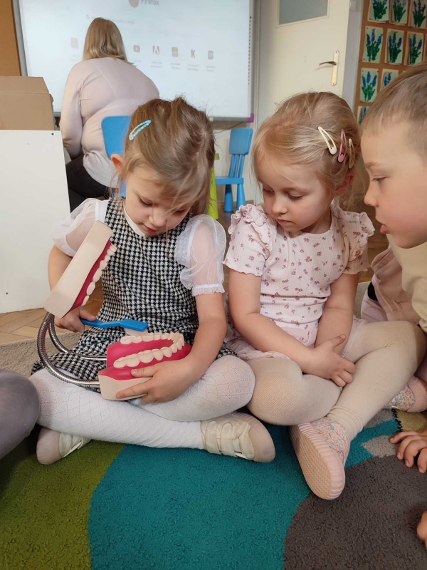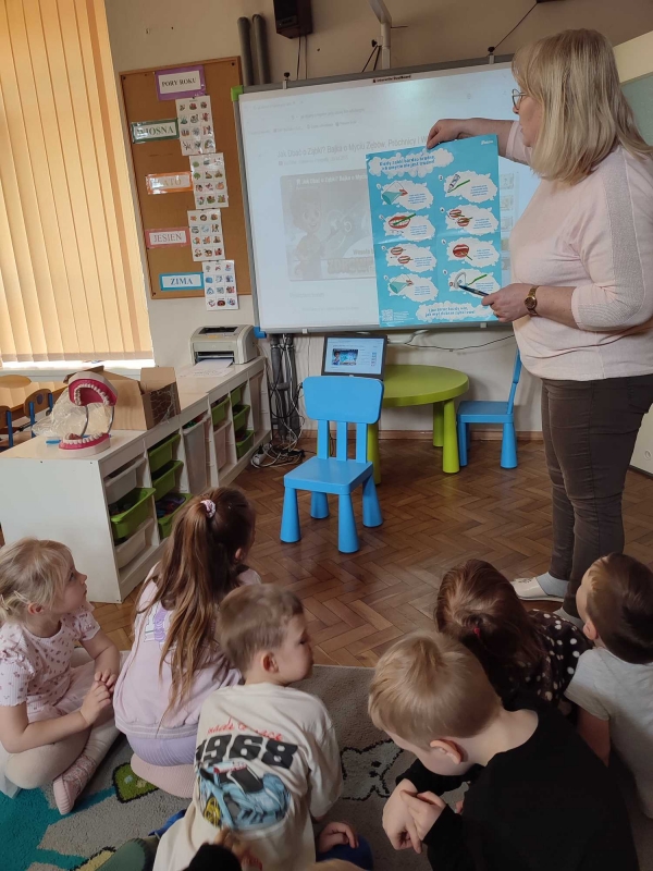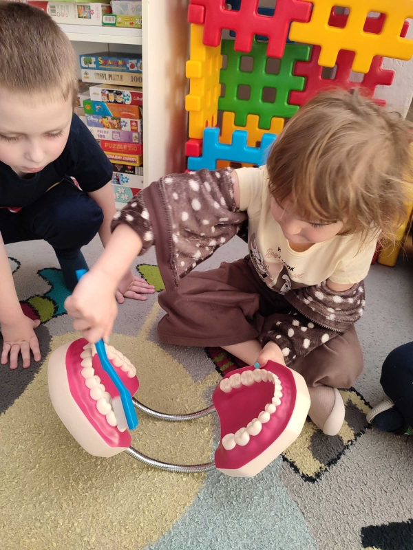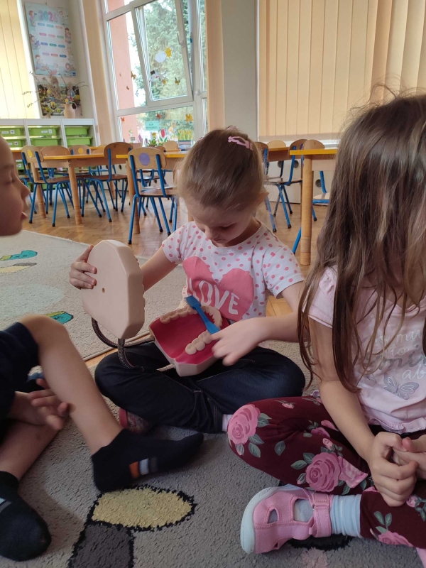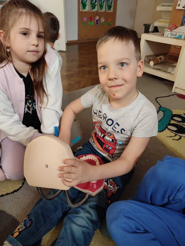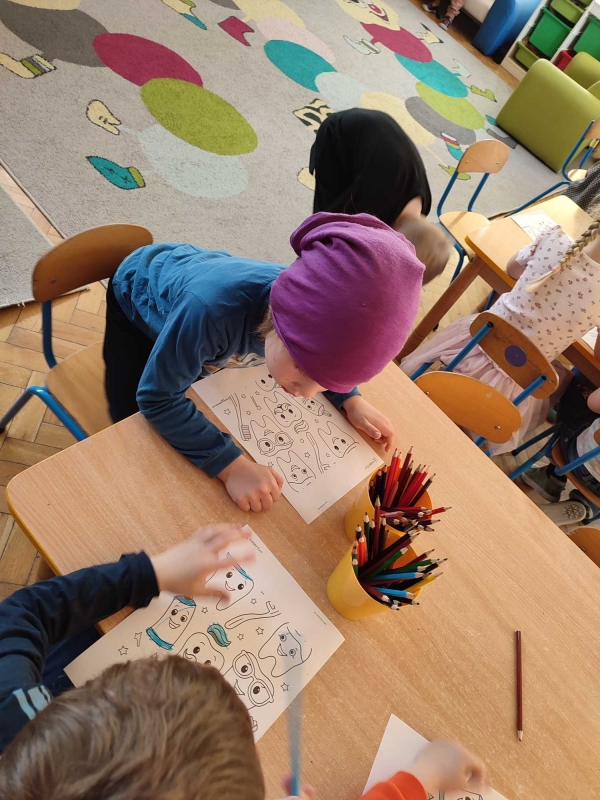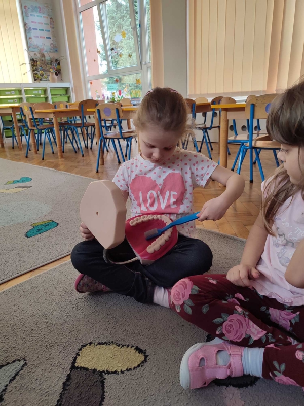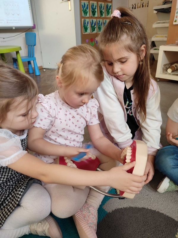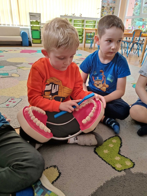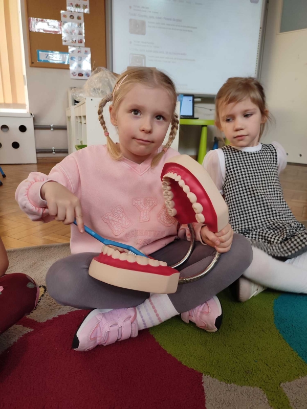 Dzieci z grupy V rozmawiały o znaczeniu higieny jamy ustnej oraz o tym, jak prawidłowo dbać o zęby. Przypomniały sobie, jak ważne jest regularne mycie zębów oraz jakie produkty pomagają utrzymać zdrowy i piękny uśmiech. Dzieci obejrzały również film edukacyjny z serii ,,Środa z profilaktyką'' pt. ,,Jak prawidłowo dbać o higienę jamy ustnej''. Przedszkolaki miały także możliwość wyszczotkowania sztucznej szczęki. Nie obyło się także bez aktywności plastycznej, podczas której dzieci malowały szczotki, pasty i ząbki. Zajęcia miały na celu kształtkowanie prawidłowych nawyków higienicznych oraz dbania o zdrowie. Były to pouczające i ciekawe zajęcia.