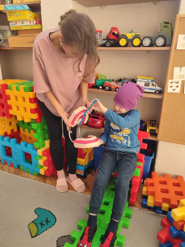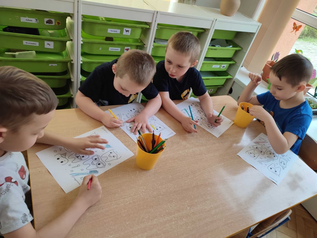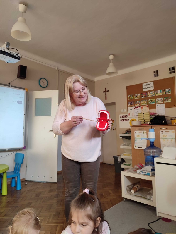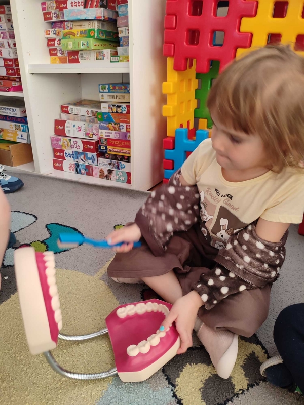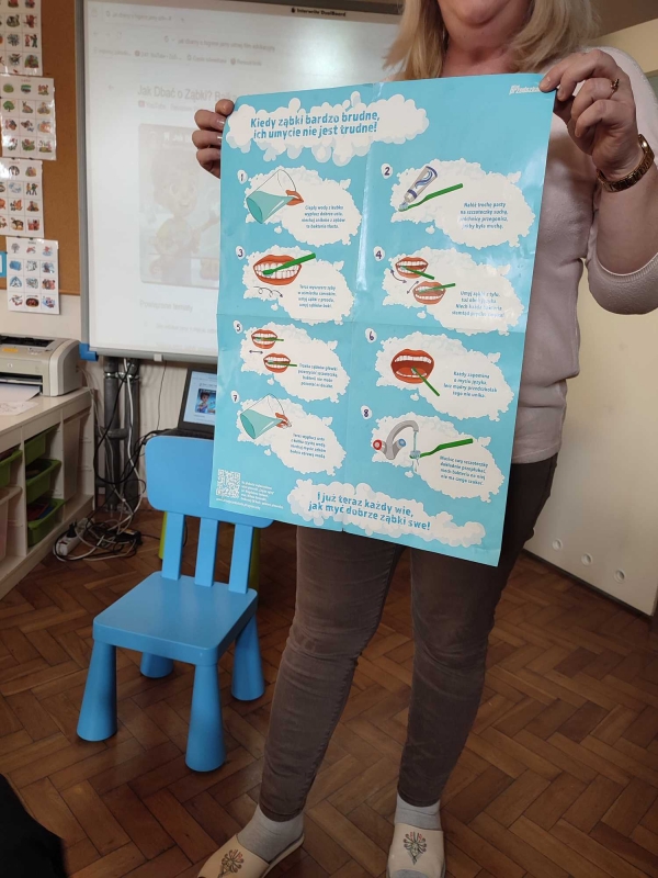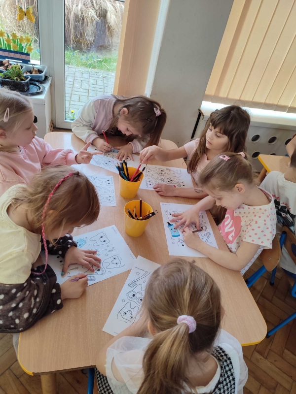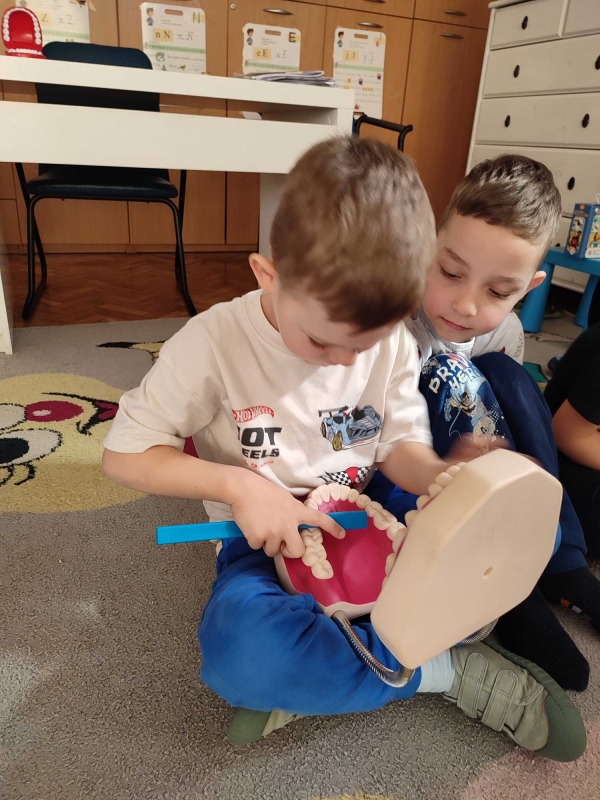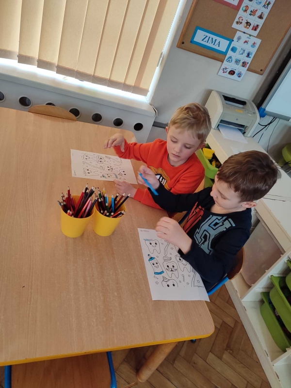Dzieci z grupy V rozmawiały o znaczeniu higieny jamy ustnej oraz o tym, jak prawidłowo dbać o zęby. Przypomniały sobie, jak ważne jest regularne mycie zębów oraz jakie produkty pomagają utrzymać zdrowy i piękny uśmiech. Dzieci obejrzały również film edukacyjny z serii ,,Środa z profilaktyką'' pt. ,,Jak prawidłowo dbać o higienę jamy ustnej''. Przedszkolaki miały także możliwość wyszczotkowania sztucznej szczęki. Nie obyło się także bez aktywności plastycznej, podczas której dzieci malowały szczotki, pasty i ząbki. Zajęcia miały na celu kształtkowanie prawidłowych nawyków higienicznych oraz dbania o zdrowie. Były to pouczające i ciekawe zajęcia.